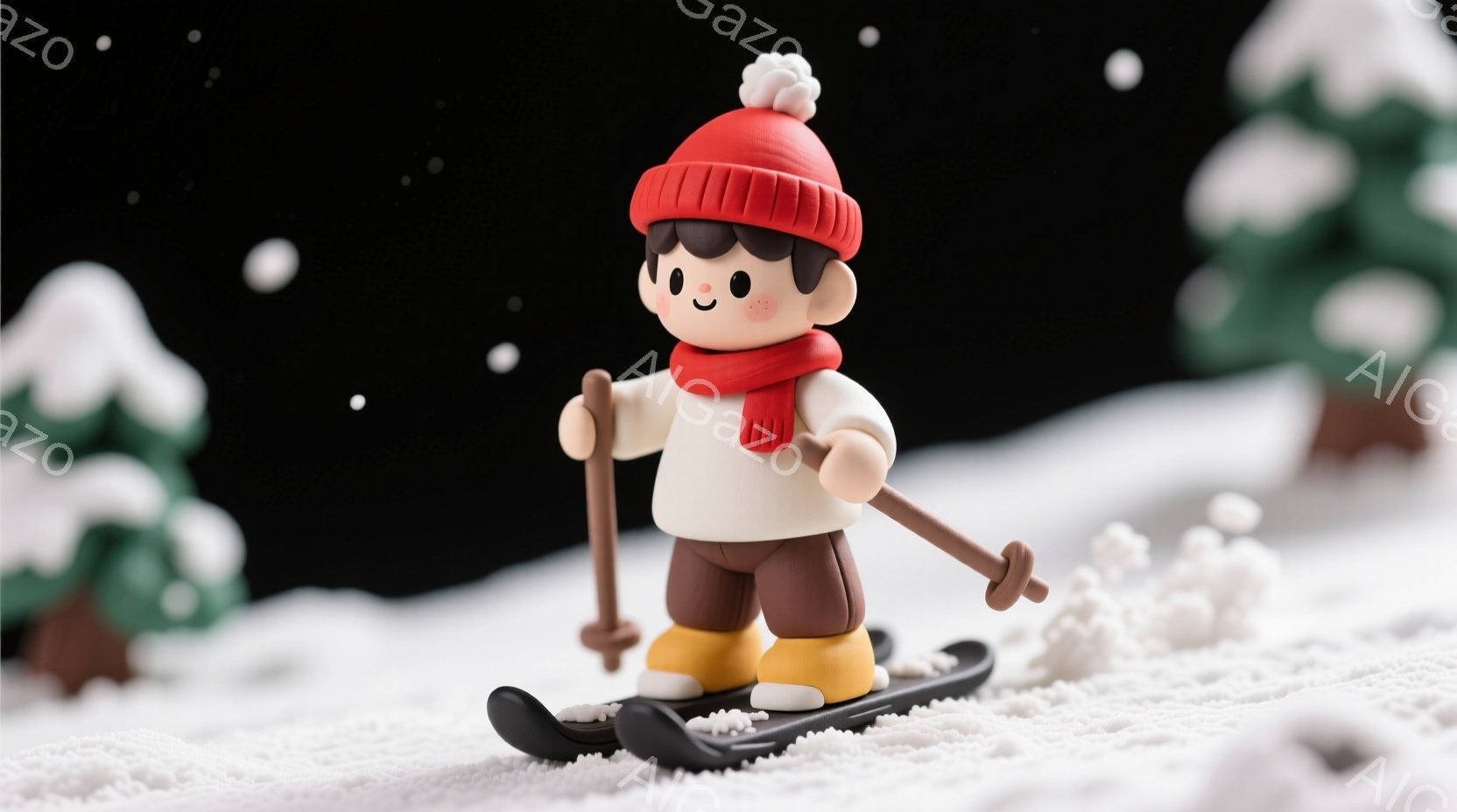 雪景色の中でスキーをする少年を描いています。少年は赤いニット帽、白いスキーウェア、茶色のスキーブーツを着用し、顔には明るい笑顔が見られます。背景には雪に覆われた松の木々と、遠くに見える小さな家々があり、雪が舞う冬の穏やかな雰囲気を醸し出しています。