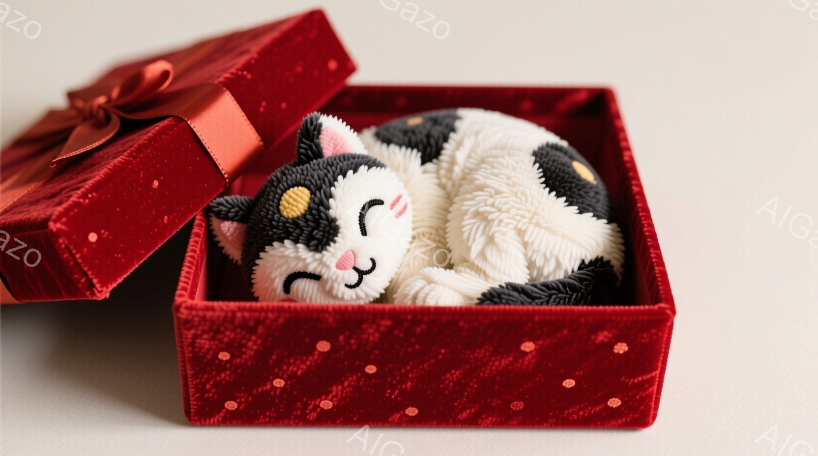 この無料AI生成画像「白と黒の猫が赤いベルベットの箱の中に丸まって眠っています。箱は開いており、金色の留め金と赤いリボンが付いています。全体的に暖かく、愛らしい雰囲気で、猫の穏やかな眠りを強調しています。」は、2025年10月25日に作成されました。 サイズは 1664×928px の高解像度で、商用利用も可能なフリー素材として提供しています。