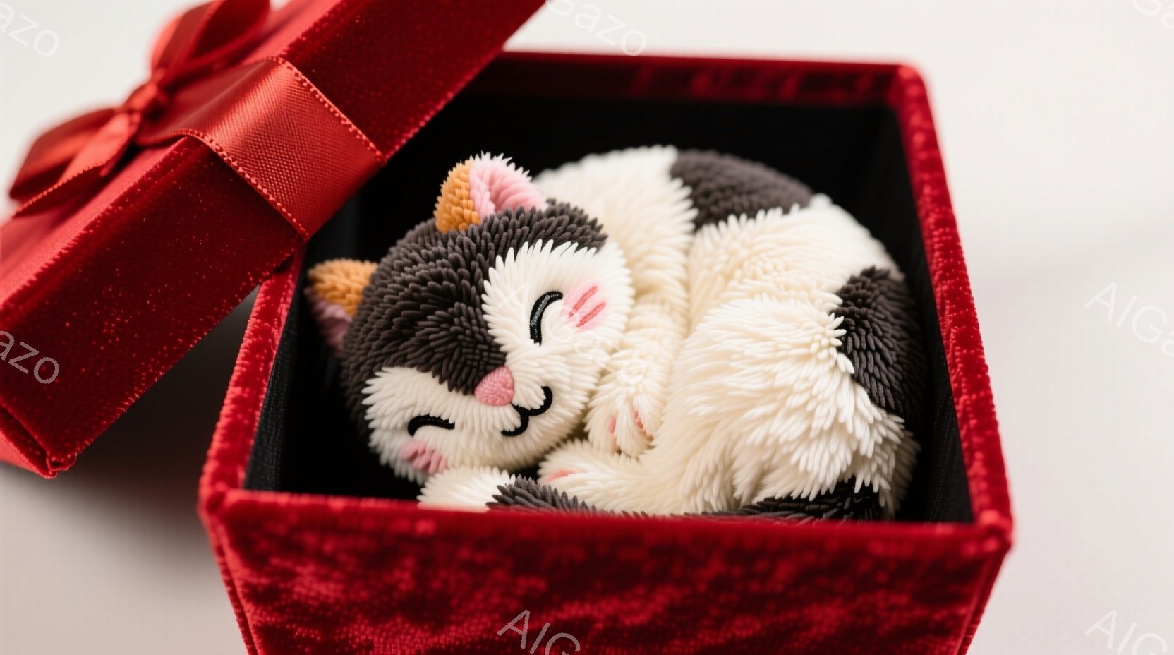 白と黒の猫が赤いベルベットの箱の中に丸まって眠っています。箱は開いており、金色の留め金と赤いリボンが付いています。全体的に暖かく、愛らしい雰囲気で、猫の穏やかな眠りを強調しています。
