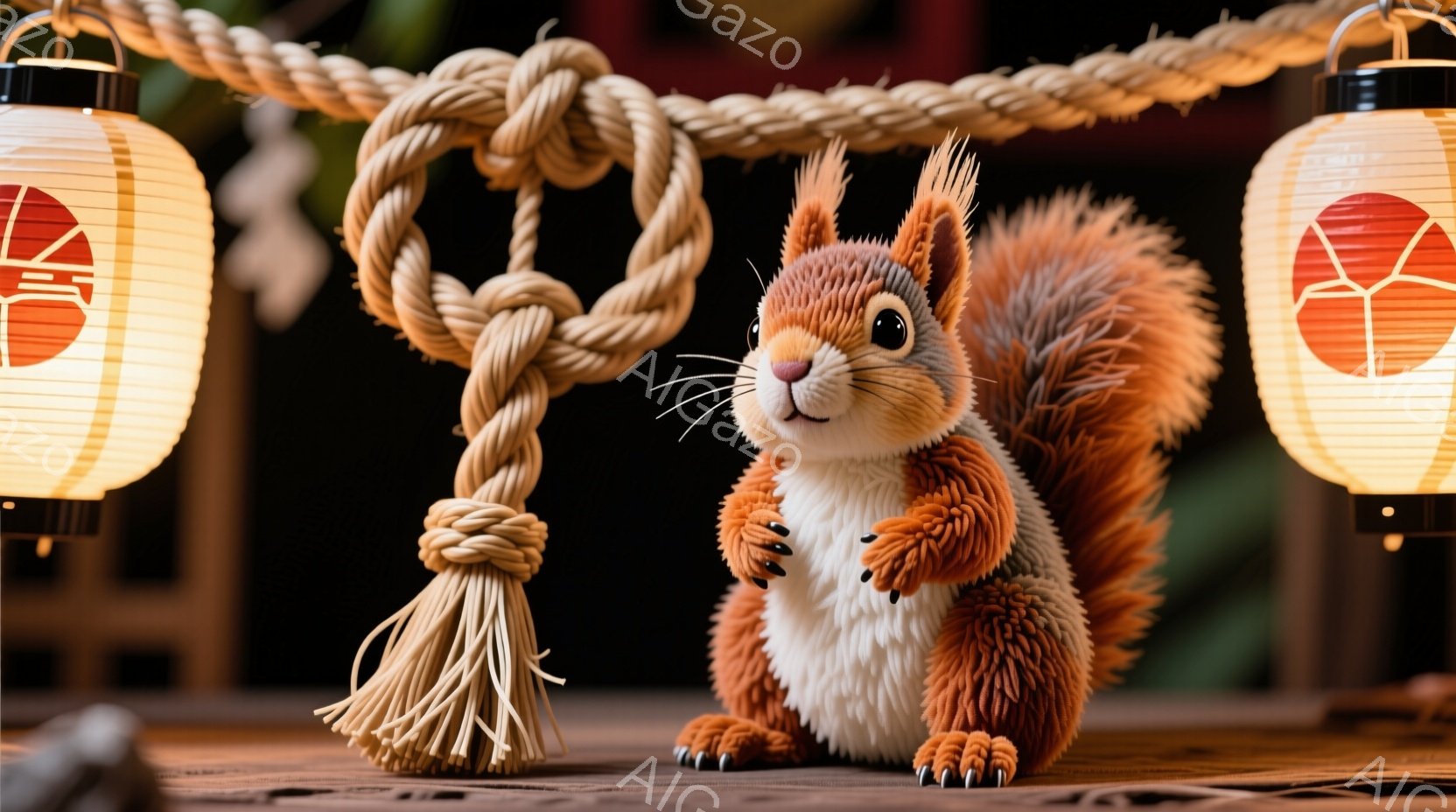 木目調の台の上にリスが立っており、可愛らしい表情をしています。背景には、日本の伝統的な装飾である注連縄と提灯が配置され、お祭りや神聖な場所を連想させます。全体的に温かみのある照明と柔らかな色使いが、平和で穏やかな雰囲気を醸し出しています。