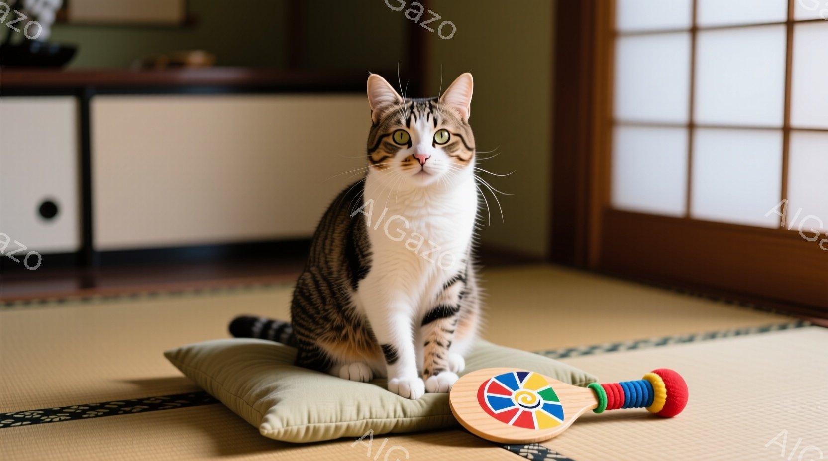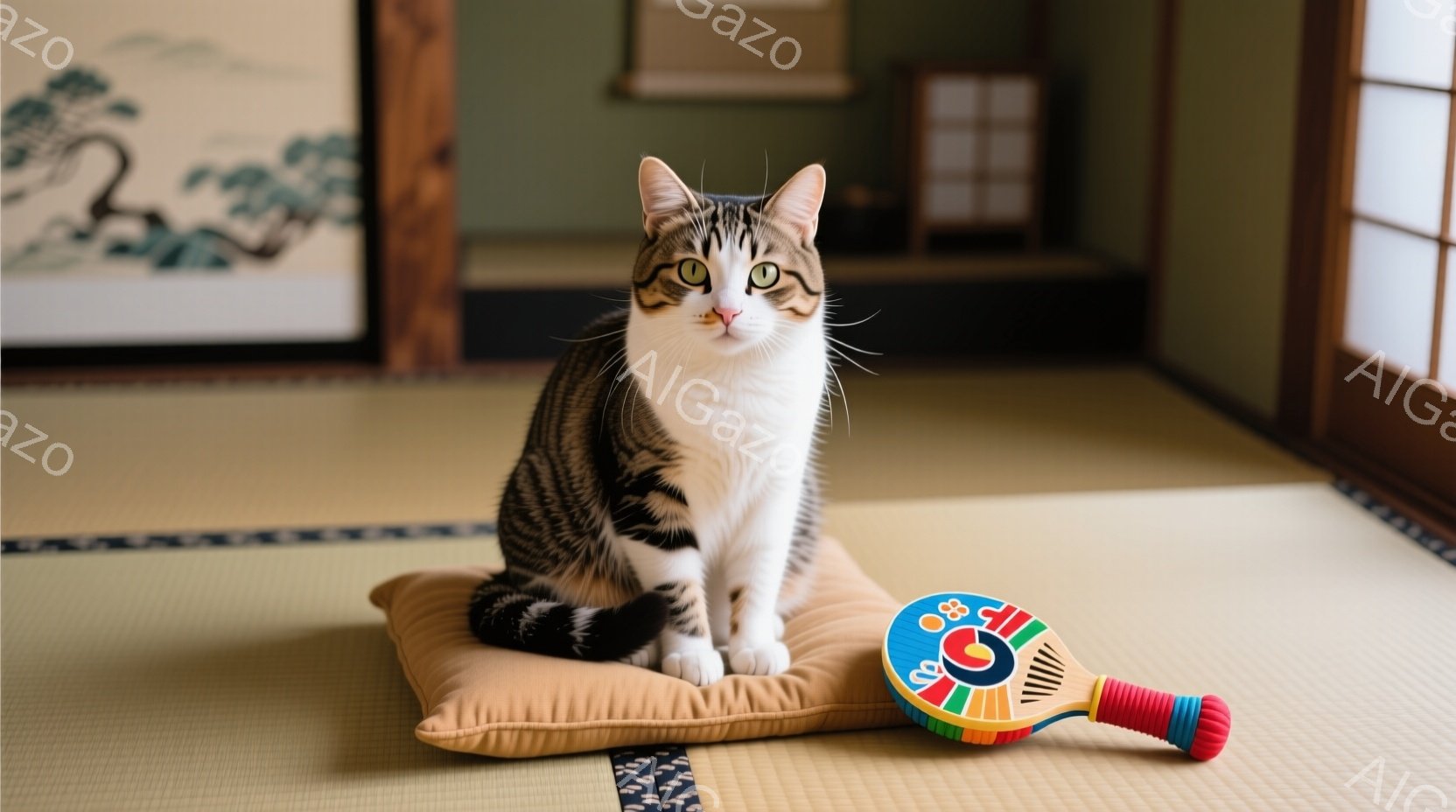 白と黒の縞模様の猫が、座布団の上に座ってこちらを見ています。猫は少し緊張した表情で、まっすぐ前を向いています。背景には畳の部屋が広がり、日本の伝統的な雰囲気が漂っています。