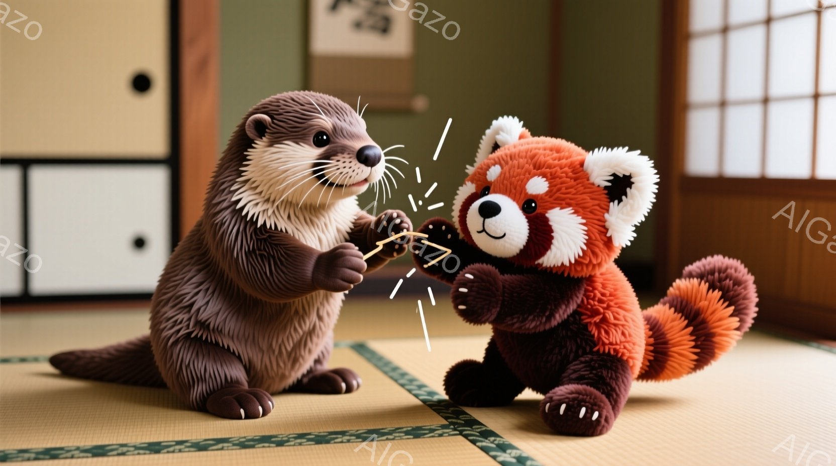 畳の上で、カワウソとレッサーパンダのぬいぐるみ同士が、一本の緑色の茎を挟んで引っ張り合っている様子が描かれている。カワウソは少し前かがみになり、真剣な表情で茎を強く掴み、レッサーパンダも同じように茎に力を込めている。背景には、障子戸や掛け軸が見え、落ち着いた和室の雰囲気が漂っている。