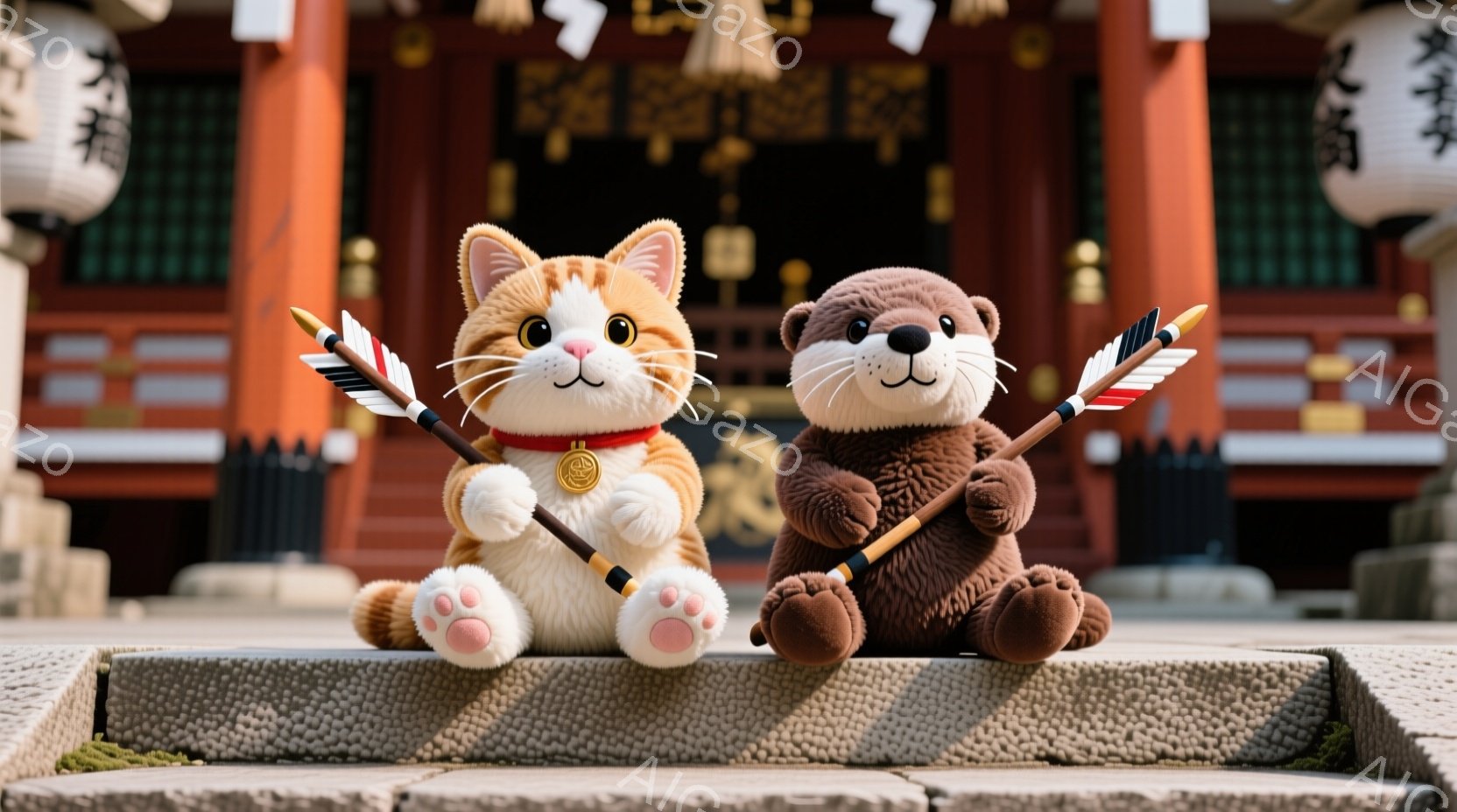畳の上に座ったカワウソとレッサーパンダのおもちゃが描かれています。カワウソは明るい笑顔で何かを差し出しており、レッサーパンダもそれを受け取ろうと手を伸ばしています。背景にはタンスのような家具が見え、室内は落ち着いた雰囲気です。