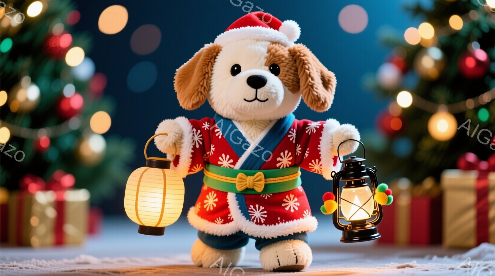 ぬいぐるみのような犬が、青い花柄の着物と赤いサンタの帽子を身に着け、片手に提灯、もう片手にランタンを持って雪の上を歩いています。背景にはクリスマスツリーやプレゼントボックスが配置され、冬の夜空を模した暗い背景に星のような光が散りばめられています。全体的に温かく、お祝いムードにあふれた、ファンタジー的な雰囲気です。