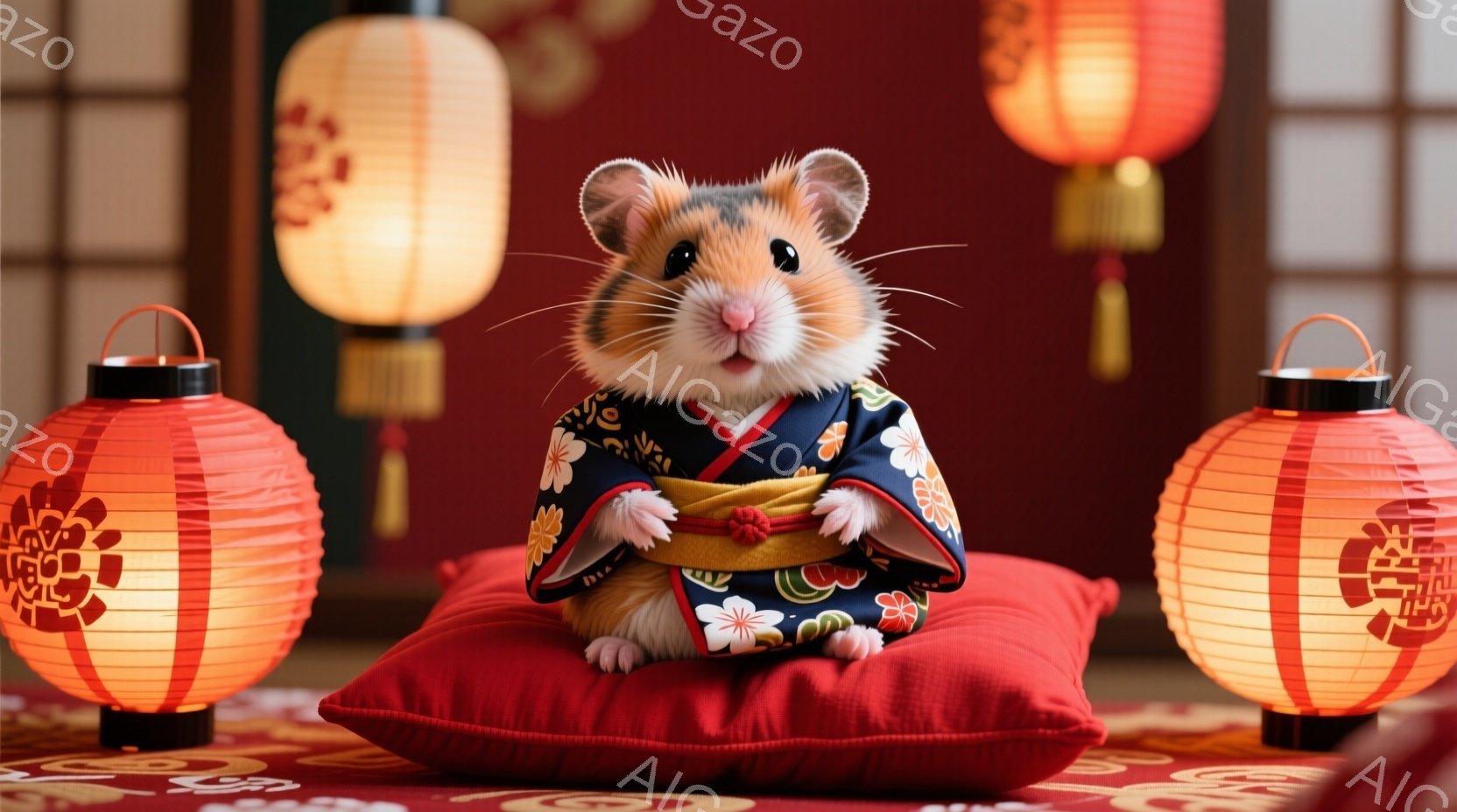 この無料AI生成画像「紺色の着物に黄色い帯を締めたハムスターが、赤いクッションの上に座って瞑想しています。背景には、提灯が並び、畳の床が見え、日本の伝統的な雰囲気が漂っています。ハムスターは穏やかな表情で、静かで平和な雰囲気を醸し出しています。」は、2025年10月26日に作成されました。 サイズは 1664×928px の高解像度で、商用利用も可能なフリー素材として提供しています。