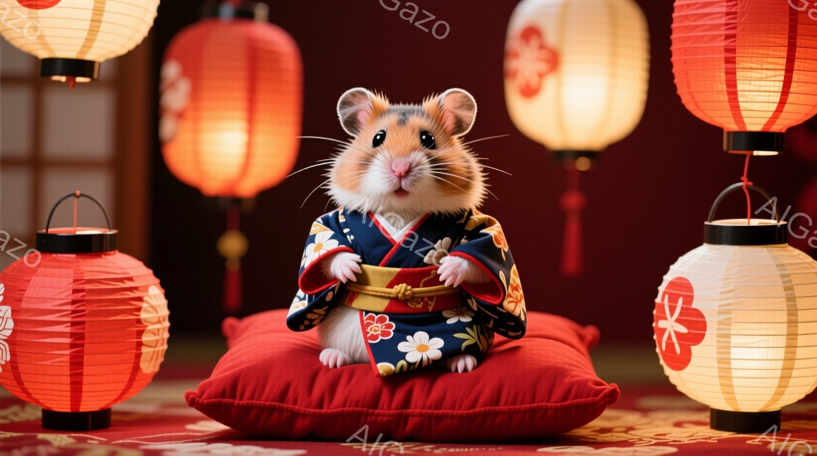 紺色の着物に黄色い帯を締めたハムスターが、赤いクッションの上に座って瞑想しています。背景には、提灯が並び、畳の床が見え、日本の伝統的な雰囲気が漂っています。ハムスターは穏やかな表情で、静かで平和な雰囲気を醸し出しています。