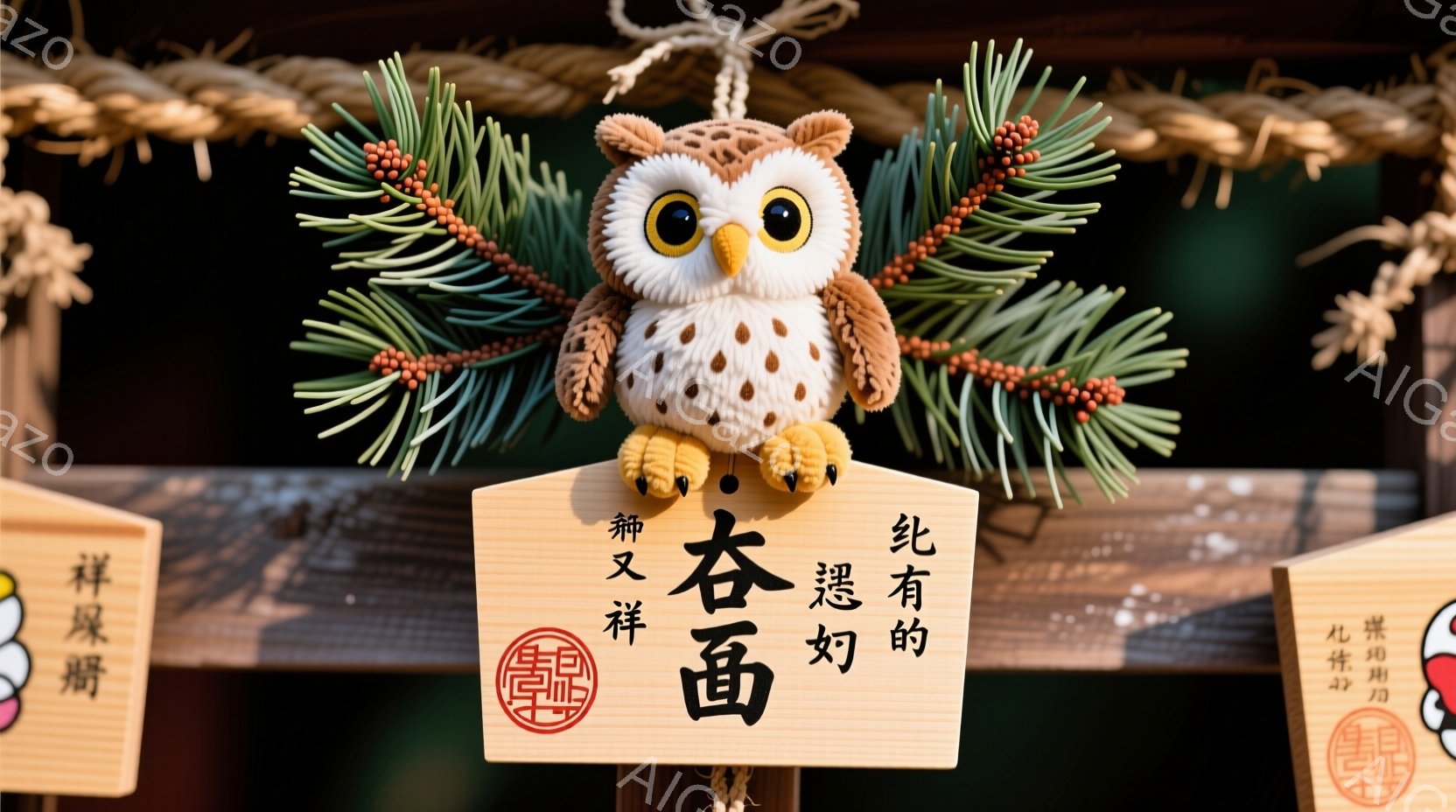 この無料AI生成画像「可愛らしいフクロウの置物が、新年の飾り付けの一部として描かれています。フクロウは茶色い着物を着ており、木の上に止まって前を見つめています。背景には、赤い文字が書かれた木製の板や、白い飾り紐が見え、お祭りや神社の雰囲気が漂います。」は、2025年10月26日に作成されました。 サイズは 1664×928px の高解像度で、商用利用も可能なフリー素材として提供しています。