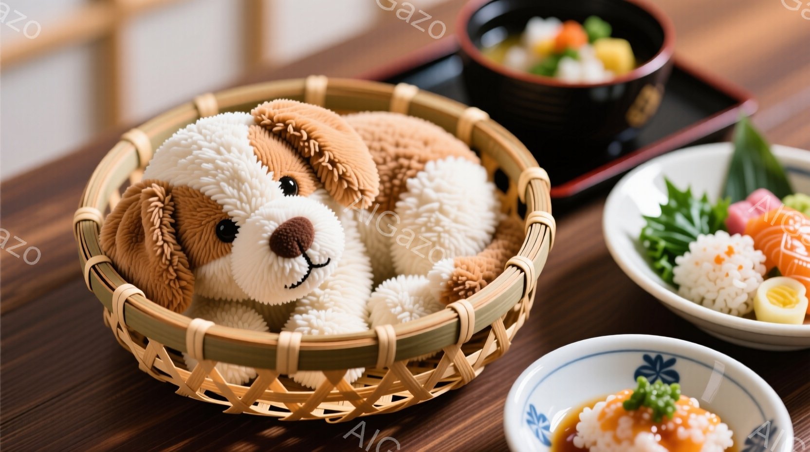 籐編みの籠の中に、ふわふわの茶色と白の犬のぬいぐるみが入っています。周りには、お茶碗や小皿など、日本の食事が盛り付けられた器が置かれ、食卓の様子が伺えます。全体的に温かく、落ち着いた雰囲気で、まるでぬいぐるみが食事を楽しんでいるかのようなユーモラスな光景です。