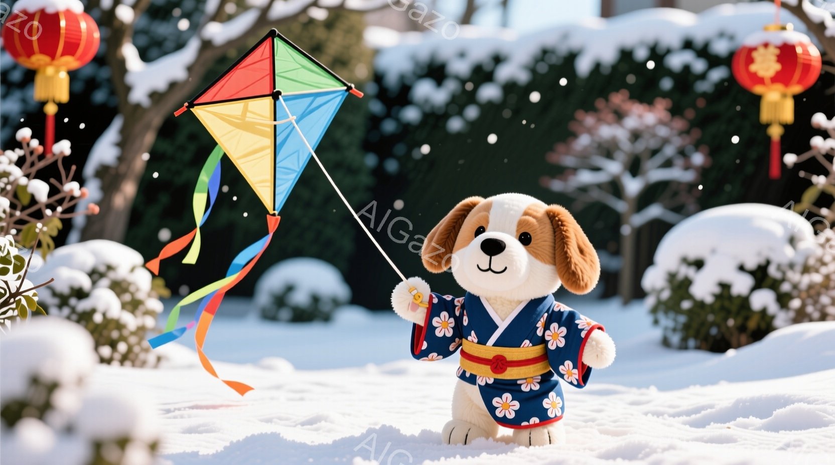 白い雪景色の中に、青い着物を着た犬のぬいぐるみがおもちゃの凧を高く掲げて立っています。凧は赤、黄、青、緑のカラフルな色で、雪景色に鮮やかなコントラストを添えています。背景には、雪に覆われた茂みや赤い提灯が見え、全体的に穏やかで冬の祝祭の雰囲気が漂っています。