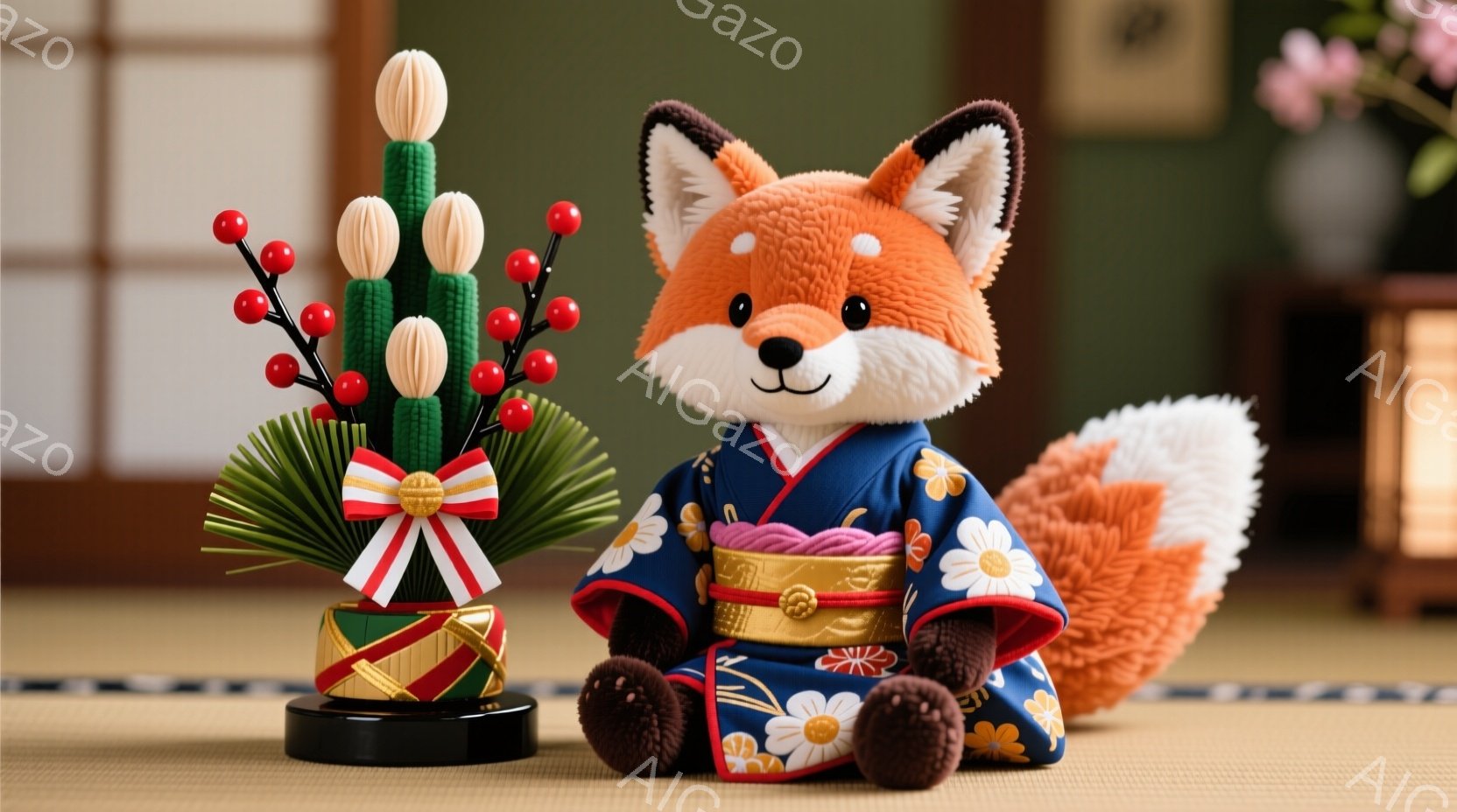 この無料AI生成画像「明るい藍色の着物を着た、ふわふわのオレンジ色の狐のぬいぐるみが座っています。着物には白い花柄が描かれており、茶色の帯が締めてあります。背景には畳と襖があり、台座に乗ったお祝いの花飾りと共に、落ち着いた和の雰囲気が漂っています。」は、2025年10月26日に作成されました。 サイズは 1664×928px の高解像度で、商用利用も可能なフリー素材として提供しています。