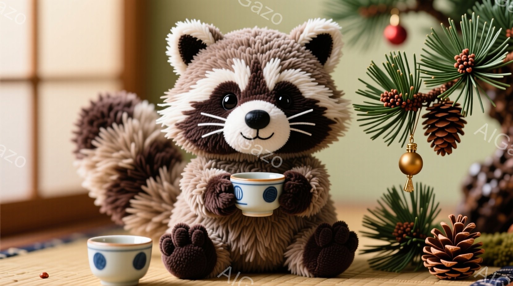 ふわふわの茶色のタヌキのぬいぐるみは、片手に小さな白い湯呑みを持って座っています。湯呑みには青い花模様が描かれており、ぬいぐるみは穏やかで優しい表情をしています。背景には畳と襖、そして緑の葉と松ぼっくりがあり、日本の伝統的な雰囲気を感じさせる静かな空間が表現されています。
