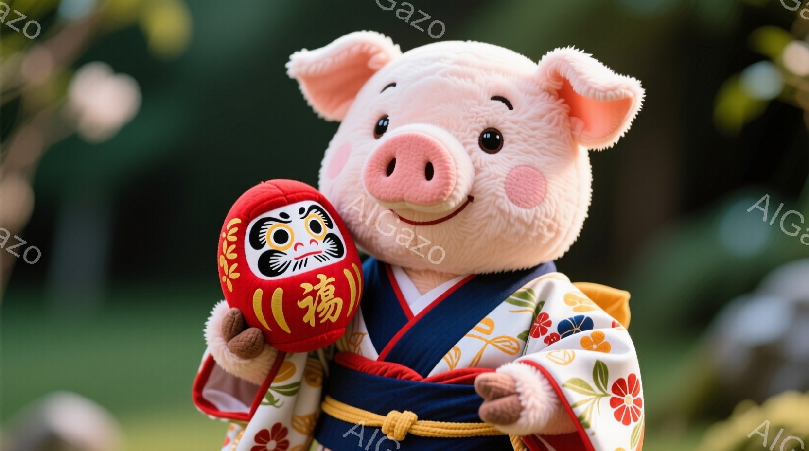 鮮やかな紺色の着物を着た、可愛らしいピンク色の豚のぬいぐるみが描かれています。豚は笑顔で、片手に赤くて金色のだるま人形を抱えています。背景には、ぼやけた桜の花が咲き誇り、春らしい穏やかな雰囲気が漂っています。