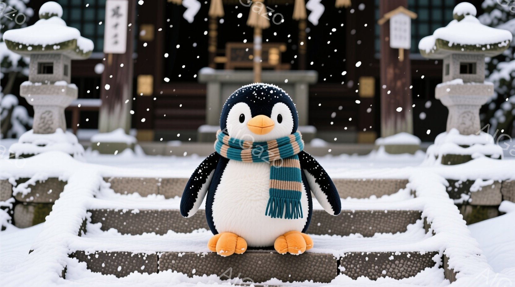 白い雪が降り積もる寺院の階段に、ふわふわのペンギンのぬいぐるみが立っています。青いストールを首に巻き、丸い瞳でこちらを見ており、とても可愛らしい表情をしています。背景には鮮やかな朱色の寺院が見え、雪景色とのコントラストが美しい、温かい雰囲気の画像です。