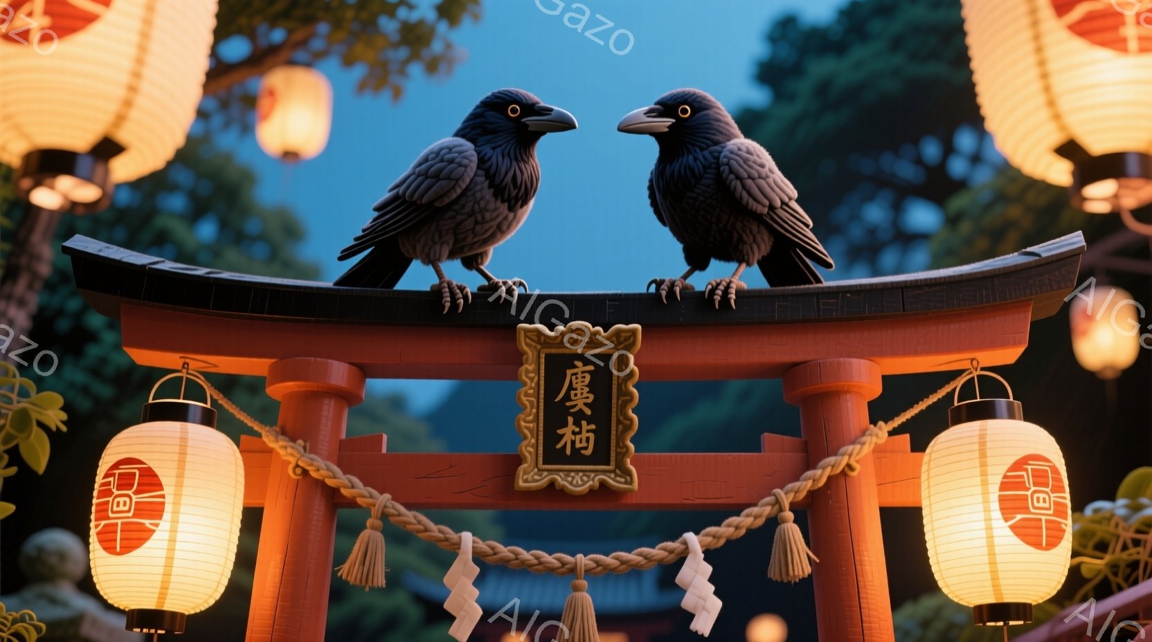 鳥居の上に2羽のカラスが止まっています。赤い提灯が鳥居の周りに吊るされ、背景には緑豊かな山々と夕焼け空が広がっています。全体的に、静かで穏やかな、どこか懐かしい雰囲気を感じさせます。