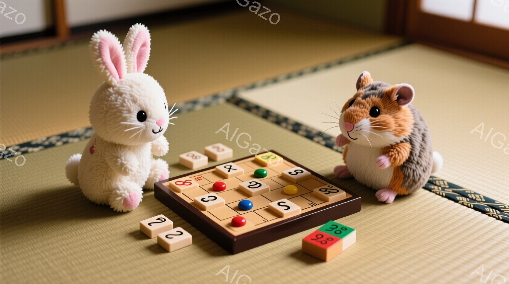 畳の上で、可愛らしいウサギとリスのぬいぐるみがお座りになっています。二つのぬいぐるみは将棋盤の前に座り、将棋の駒がいくつか並んでいます。背景は落ち着いた畳の部屋で、全体的に温かく、遊び心のある雰囲気が漂っています。