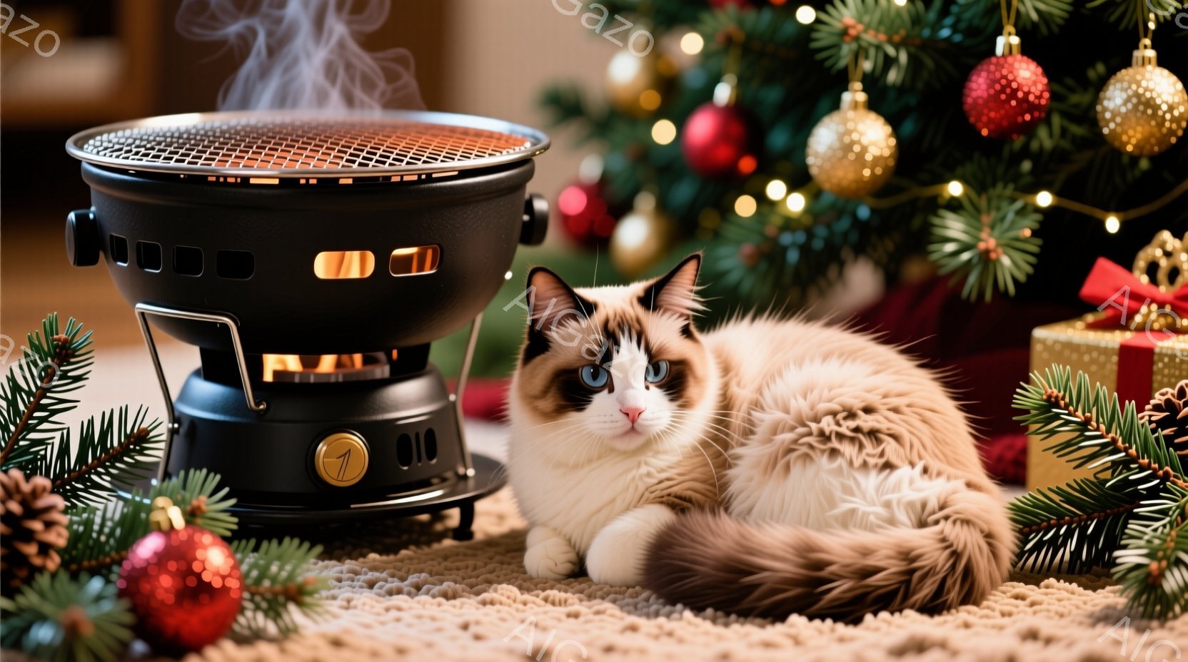 長毛の猫が、クリスマスのプレゼントや飾りがある部屋の中で、暖房器具の前に丸まって座っています。猫は薄茶色と白の毛並みで、澄んだ青い目をしており、どこか物憂げな表情を浮かべています。背景には緑のクリスマスツリーや赤いオーナメントが見え、暖炉からの煙が立ち上る様子から、温かく穏やかなクリスマスの雰囲気が伝わってきます。