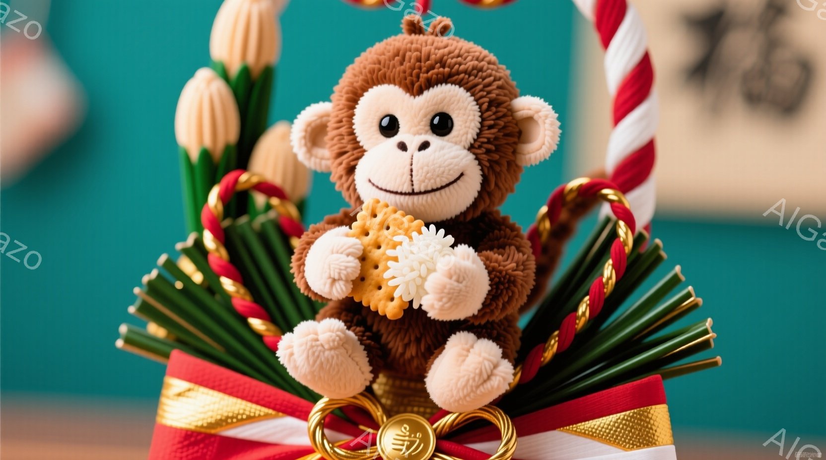 明るい緑色の背景に、可愛らしいおもちゃの猿が飾られています。猿は茶色い毛並みで、片手に金色のクッキーを持って微笑んでいます。背景には、カラフルな縁起の良い飾りや和風の模様が見え、お祝いの雰囲気が漂っています。