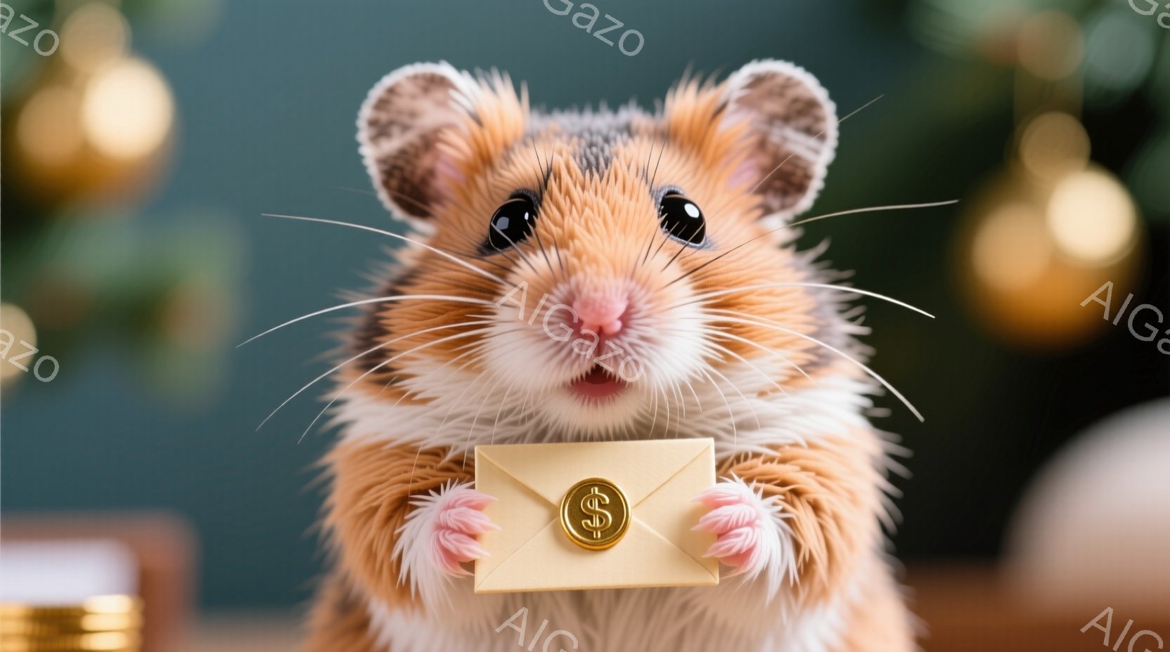 ハムスターが正面を見つめ、両手で黄色い封筒を握っています。封筒にはドルマークが描かれており、ハムスターは少し緊張したような、真剣な表情をしています。背景は緑色の自然で、浅い奥行きがあり、ハムスターに焦点が当たっています。