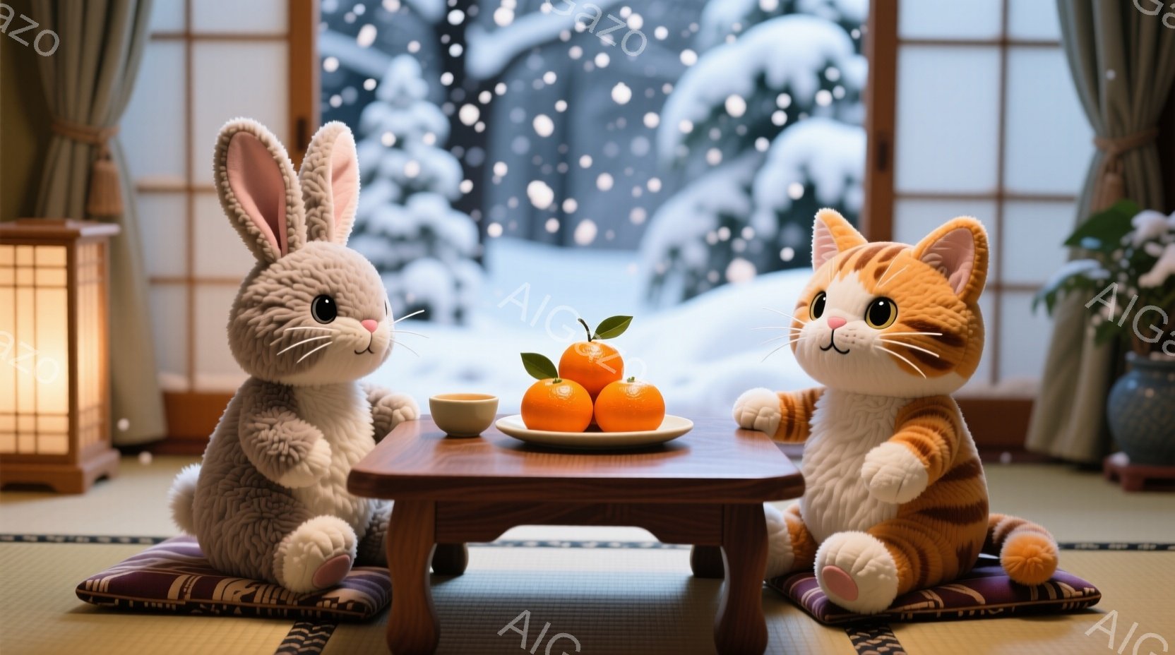 白いウサギと茶色のトラ猫が、低いちゃぶ台を挟んで向かい合って座っています。ウサギと猫はどちらもクッションの上に座り、テーブルの上にはみかんと湯呑みが置かれています。背景には雪景色が見え、畳の部屋には暖かく穏やかな雰囲気が漂っています。