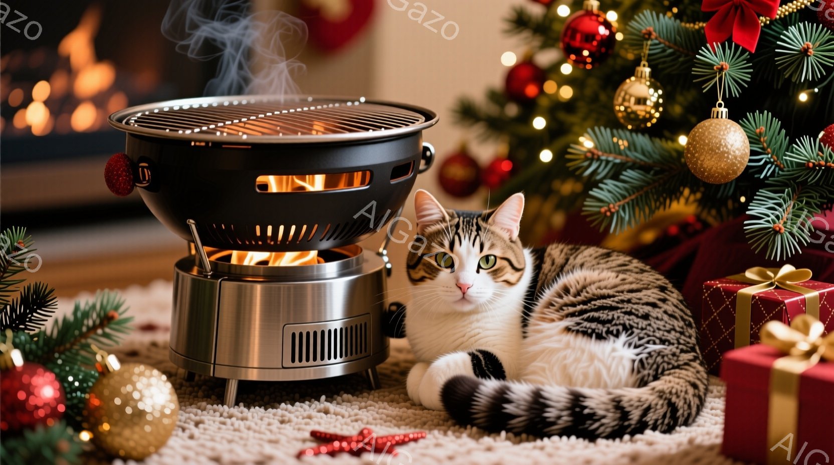 白と茶色のペルシャ猫が、暖炉のように見える小型の電気ストーブの前に丸まって座っています。背景には、クリスマスツリーの飾りやプレゼントの箱が見え、暖かく穏やかな冬の雰囲気が漂っています。猫は穏やかな表情で、リラックスした様子で暖を取っているようです。
