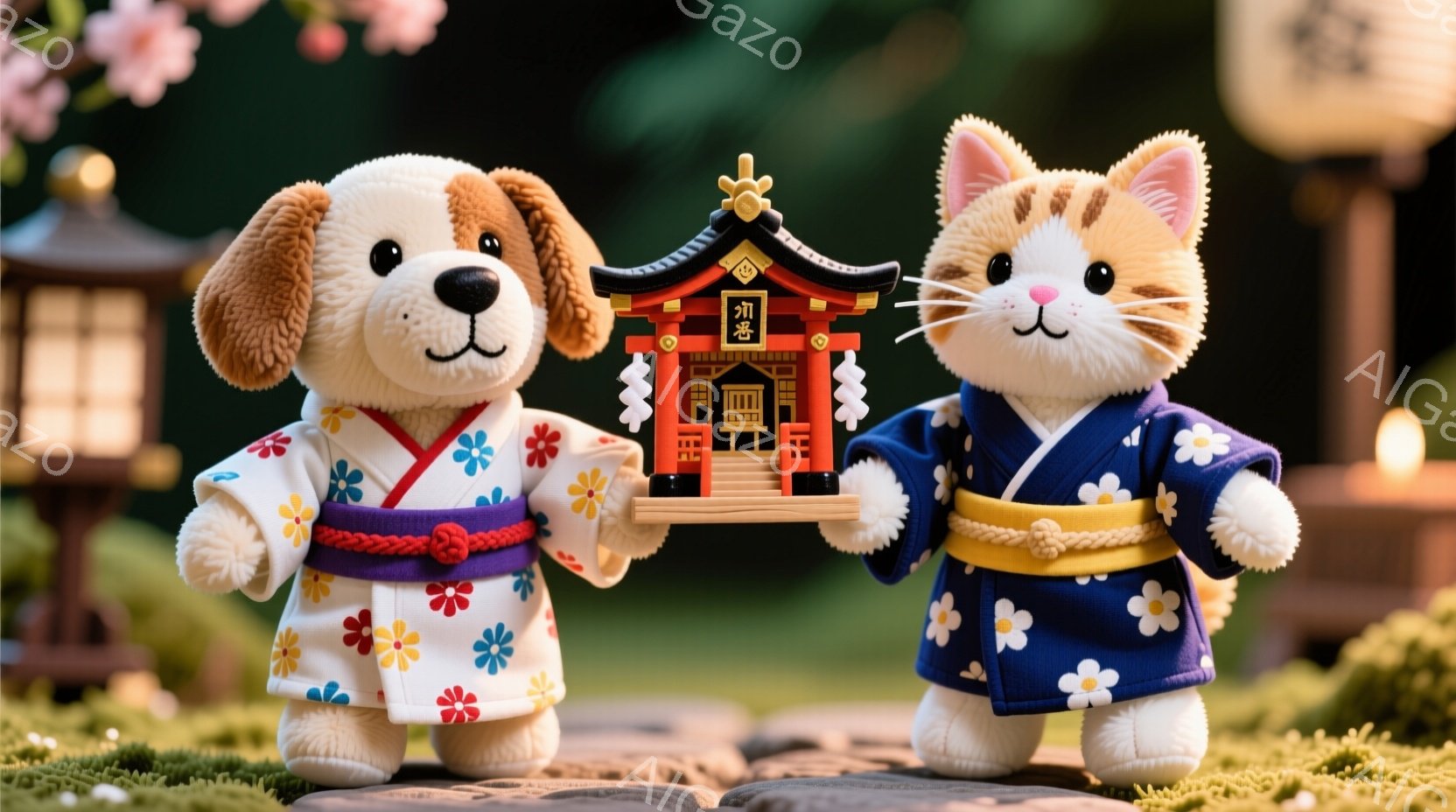 茶色い犬とオレンジ色の猫が、赤い屋台のようなものをロープで協力して引っ張っています。犬は青地に白い花が描かれた着物、猫は白地にオレンジ色の花が描かれた着物を着ており、共に赤い帯で結ばれています。背景にはぼやけた緑と提灯が見え、お祭りやイベントのような賑やかな雰囲気が感じられます。
