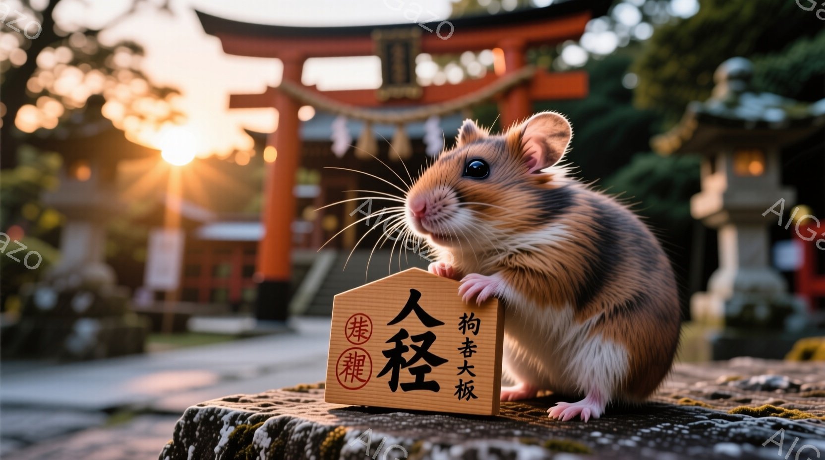 古都の朱色の神社の石段の上に、小さなハムスターが立っている。ハムスターは毛並みが美しく、少し緊張した表情で前を見つめている。背景には、太陽の光が差し込む朱色の鳥居と緑豊かな自然が広がり、神秘的で穏やかな雰囲気を醸し出している。