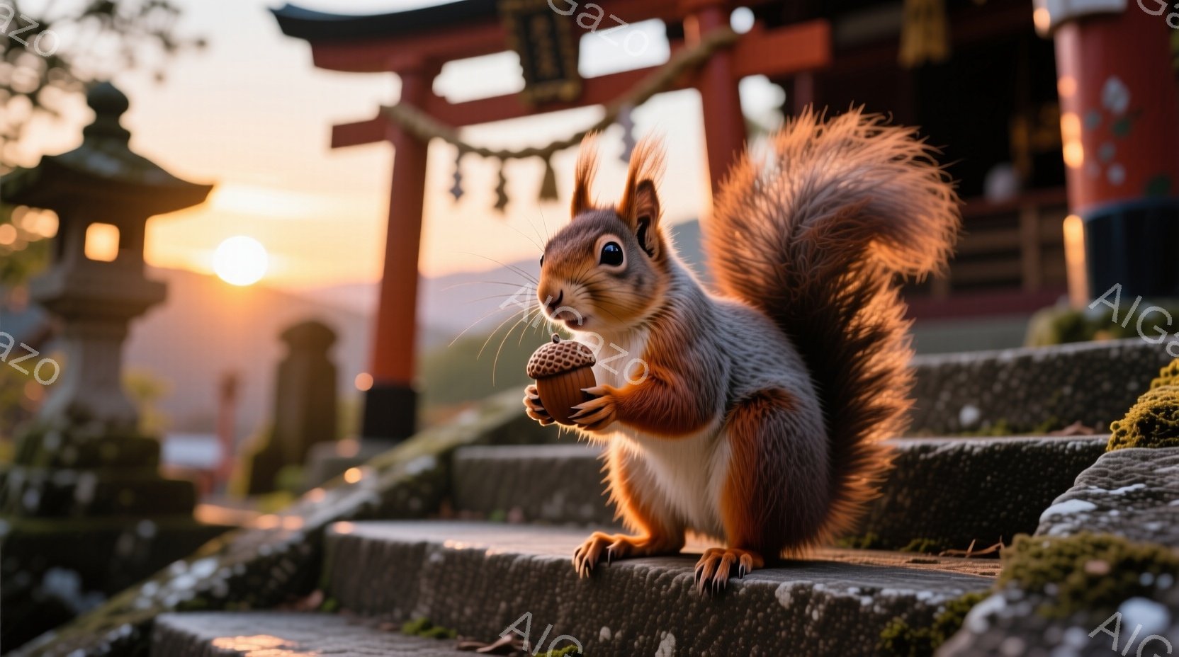 雪をまとった丘の上に、鮮やかな赤色の狐が凛々と立っている。背景には、夕焼けに照らされた鳥居と、遠くに見える街並みが広がり、幻想的な雰囲気を醸し出している。雪と夕焼けのコントラストが美しく、静寂の中に力強い生命を感じさせる。