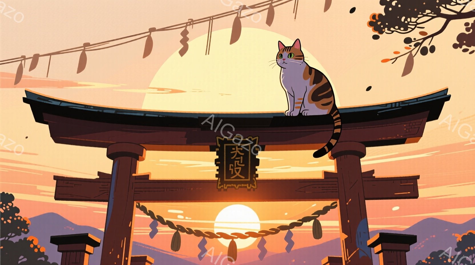 鮮やかな夕焼けを背景に、鳥居の上で猫が座っています。猫は縞模様で、リラックスした表情で遠くを見つめています。背景には、山々と穏やかな空が広がり、全体的に静かで穏やかな雰囲気が漂っています。