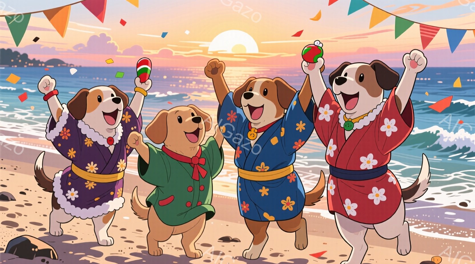 砂浜を走る犬たちが描かれています。赤、緑、赤、青の日本の伝統的な柄の法被をそれぞれ着ており、頭にはサンタの帽子をかぶっています。背景には、夕焼け空と打ち寄せる波、そして遠くに見える建物があり、お祝いのような賑やかな雰囲気が漂っています。