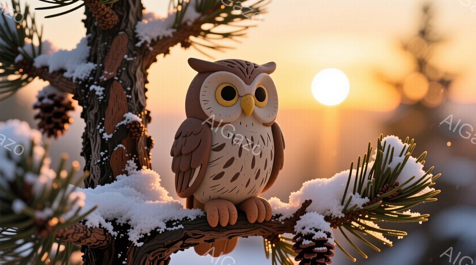 茶色のフクロウが雪で覆われた木の枝にとまっており、大きな丸い目が特徴的です。背景は夕焼けのようなオレンジ色の空と、雪景色が広がっており、冬の静寂で幻想的な雰囲気を醸し出しています。枝には雪が積もり、フクロウの周りも冬の寒さを感じさせます。