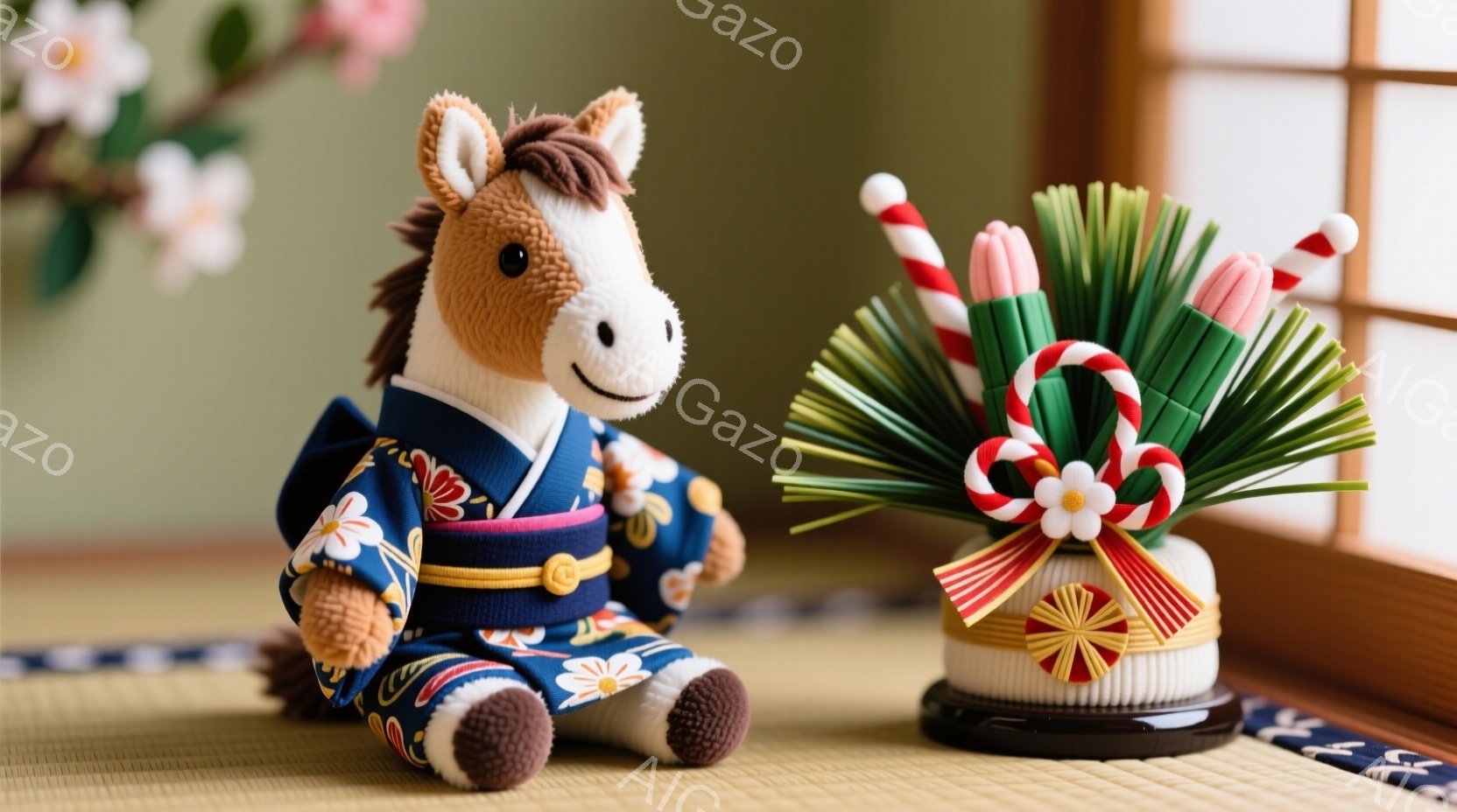 ぬいぐるみは、白い着物と青い帯を身に着け、可愛らしい花柄が描かれています。優雅に座り、穏やかな表情で、日本の伝統的なお祝いの雰囲気を醸し出しています。背景には、金色の背景と、日本の正月飾りの一つである注連縄(しめなわ)が置かれ、お祝いの雰囲気をさらに高めています。