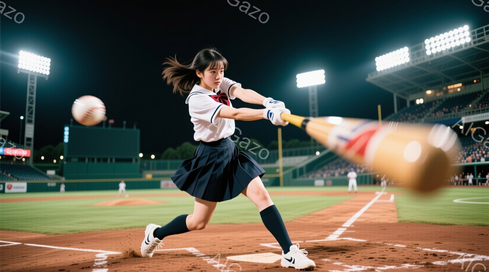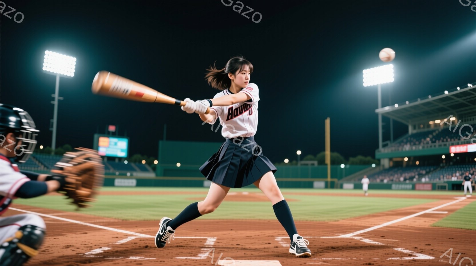 野球場でバッターボックスに立つ女性が写っている。白い短袖のユニフォームに紺色のプリーツスカート、白いスニーカーを履き、髪は後ろでポニーテールに結んでいる。彼女はバットを振りかぶり、ボールを打とうとしている姿勢で、集中した表情をしている。