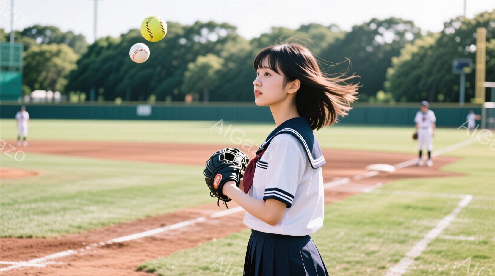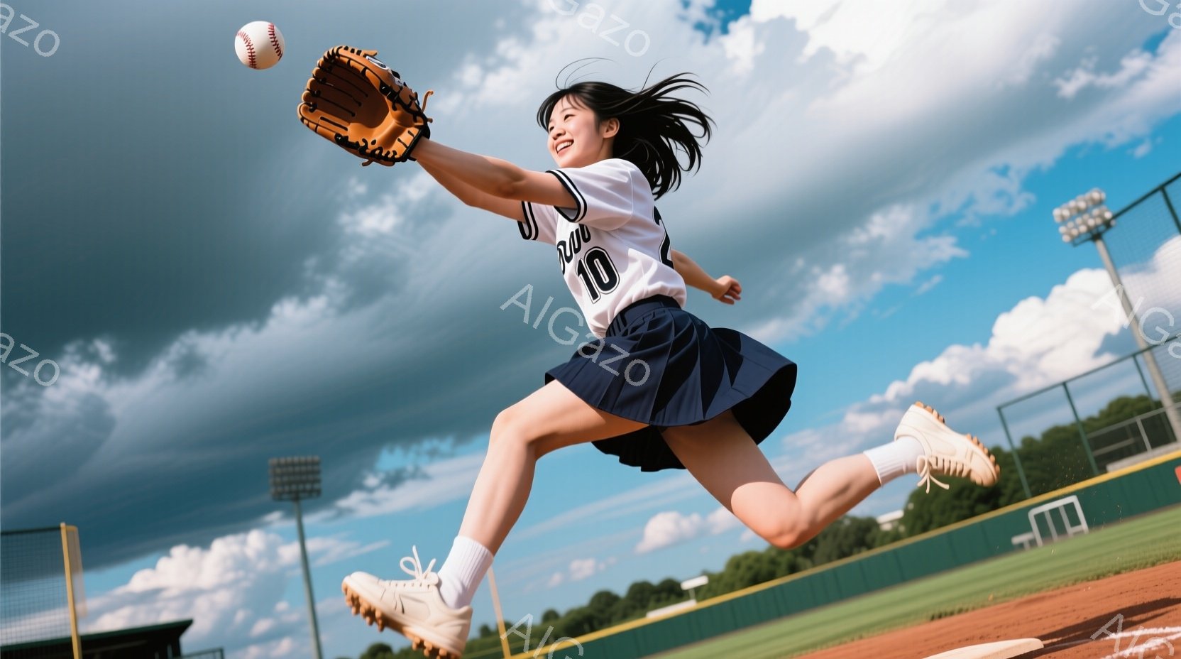 短い黒髪を風になびかせ、野球帽を被った若い女性が、野球場でポーズをとっています。白い野球着に黒いスカートを身につけ、左手にグローブを持っています。背景には緑豊かな野球場と、青空が広がっており、全体的に爽やかで若々しい雰囲気が漂っています。
