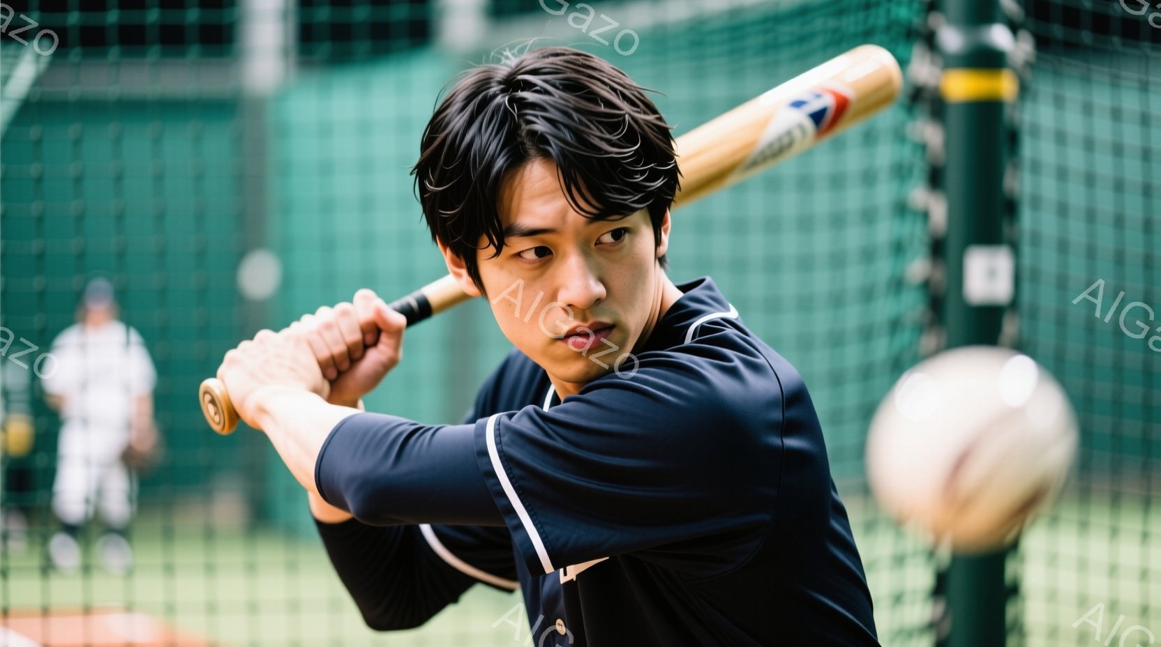 バッティング練習中の男性が写っている。黒い長袖シャツとズボンを着用し、濃い茶色の髪は短く整えられている。彼はバットを構え、強い集中力と真剣な表情でボールを待っている様子で、背景にはネットとぼやけた他の選手が見える。