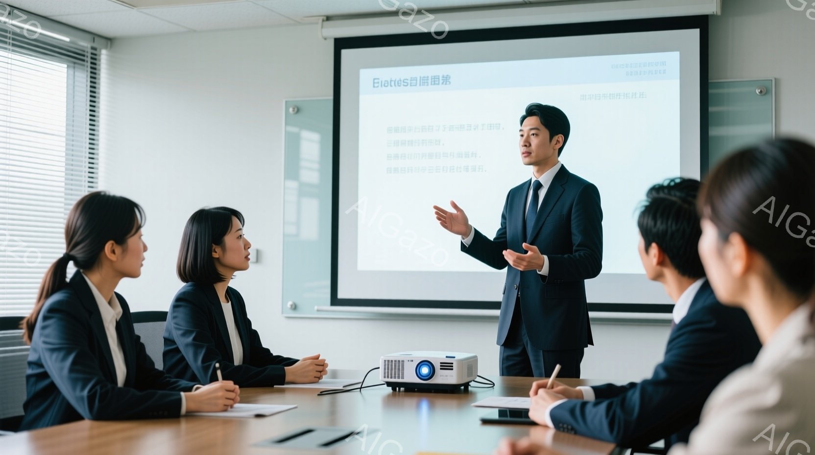会議室で、一人の女性がプレゼンテーションをしている様子が写っている。彼女は黒いスーツと白いシャツを着ており、片手を広げて説明している。他の三人は、ベージュ色のジャケットを着たビジネスマンで、彼女の話に耳を傾けている。