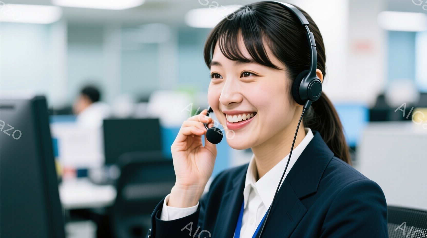 この女性は、黒いヘッドセットを着用し、明るい笑顔で電話を受けているようです。紺色のジャケットと白いシャツを身に着けており、髪は後ろでポニーテールにまとめられています。背景にはオフィスらしき空間がぼやけて見え、ビジネスシーンを彷彿とさせる、活気のある雰囲気です。