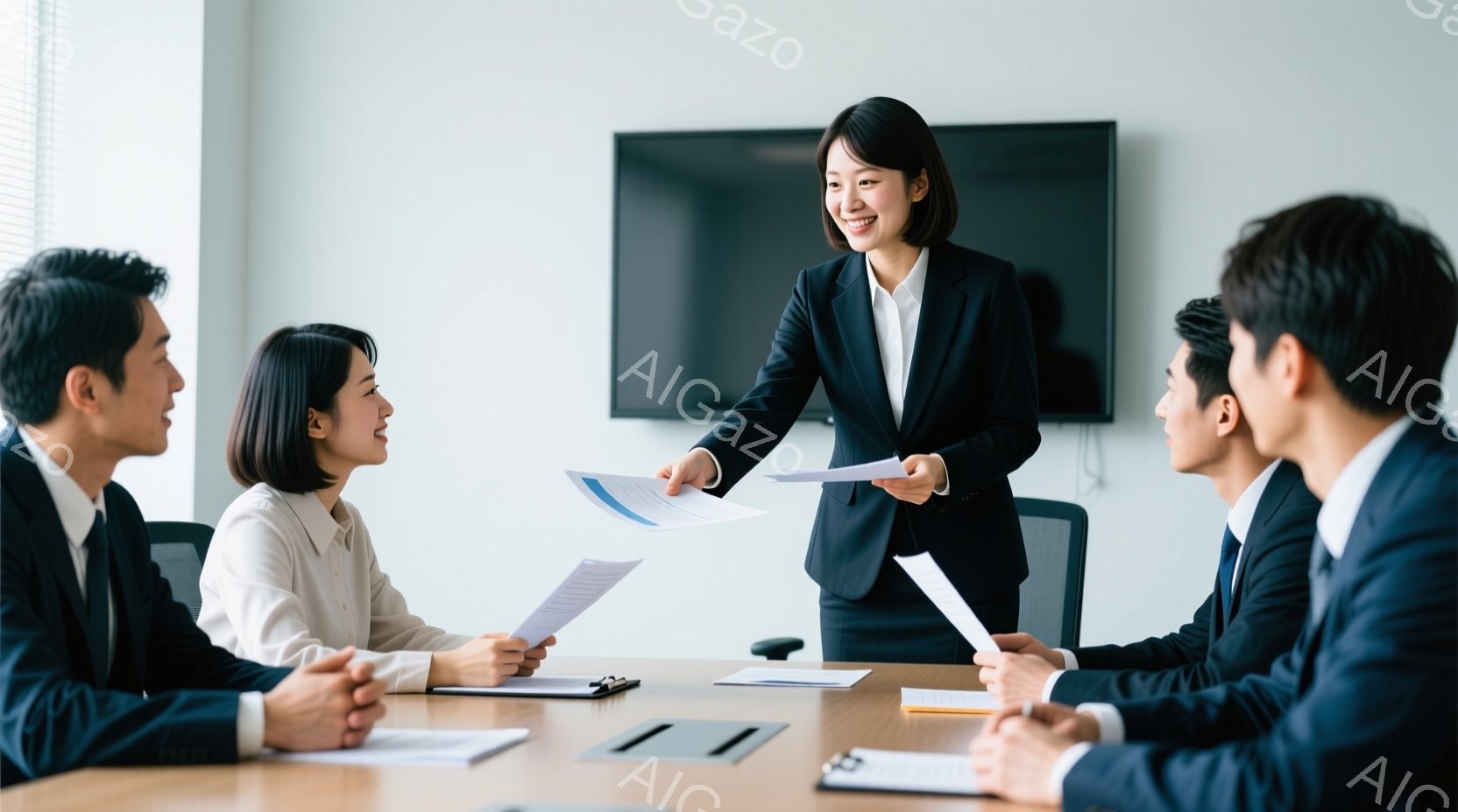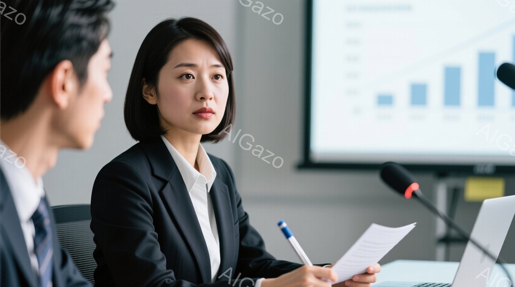 ビジネスシーンの室内が写っている。中央の女性は黒いスーツに白いシャツを着ており、手を組み、真剣な表情で誰かを見つめている。背景にはプレゼンテーションをしている男性と、白い机と椅子が見え、室内は明るく、プロフェッショナルな雰囲気が漂っている。