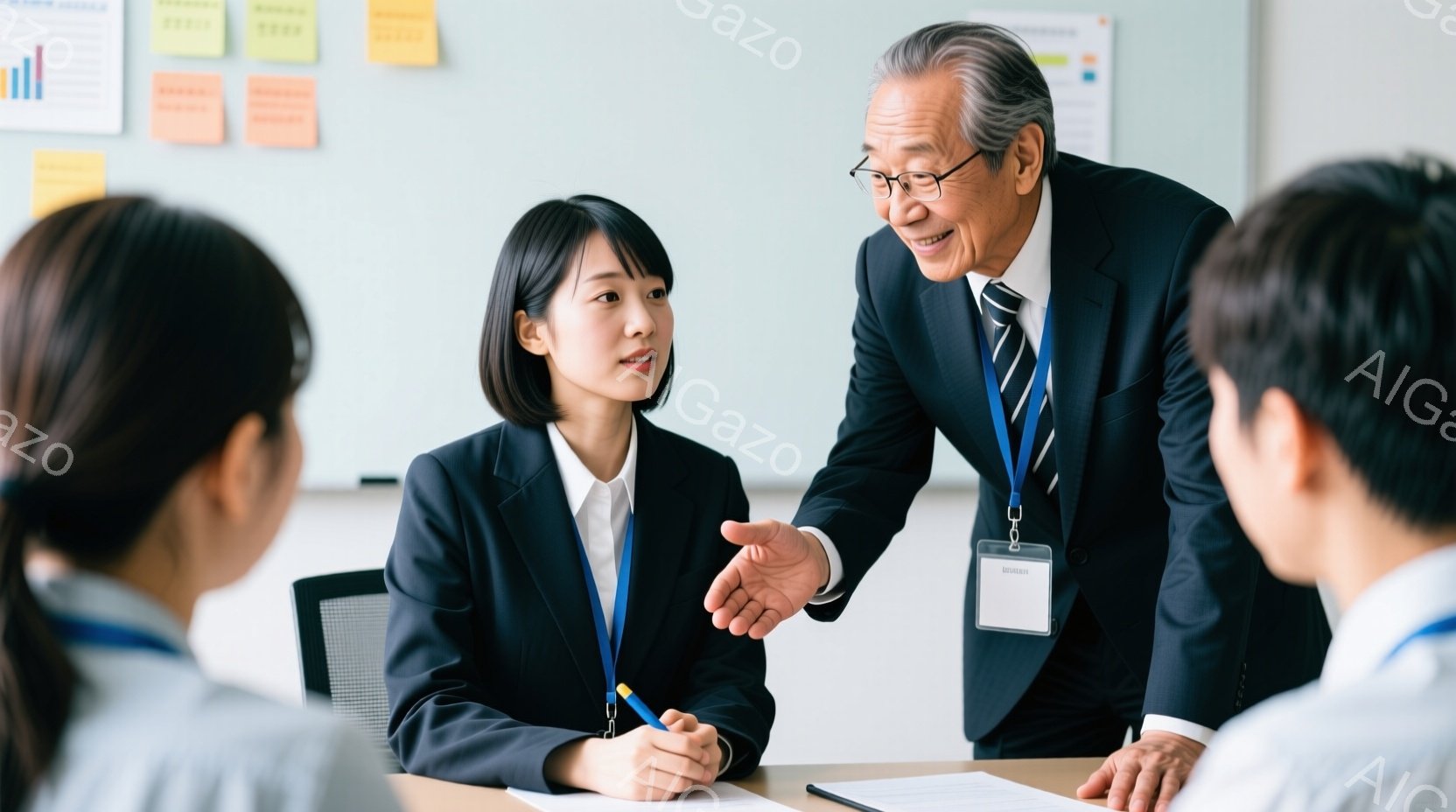 会議室で、女性社員がノートにペンで何か書き込んでいる。年配の男性社員は、身振り手振りを交えながら、何かを説明している様子で、皆が熱心に話を聞いている。背景にはグラフが描かれたボードがあり、室内は明るく、活気のある雰囲気である。