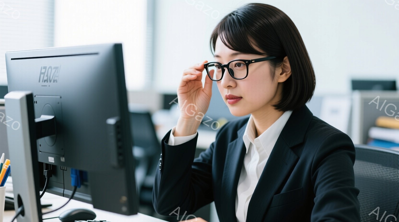 黒いスーツと白いシャツを着た女性が写っており、眼鏡を指で押さえて集中した表情をしています。彼女はオフィスのような場所でデスクに座っており、背後には他のデスクやモニターが見えます。全体的に、真剣な仕事に取り組んでいる、プロフェッショナルな雰囲気です。