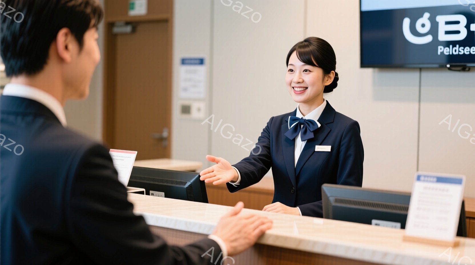 受付カウンターに立つ女性が写っています。彼女は濃い青色のジャケットとスカートのスーツを着ており、白いブラウスとネクタイを締めています。笑顔で手を広げ、親切な態度で来客を迎えようとしている様子が伺えます。
