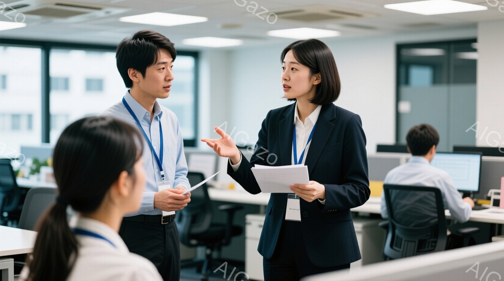オフィスで話し合っているビジネスマンとビジネスウーマンが写っています。女性は黒いスーツを着て髪を後ろにまとめ、書類を手に何かを説明しています。男性は紺色のスーツにネクタイをし、IDカードを首から下げ、女性の話に耳を傾けています。