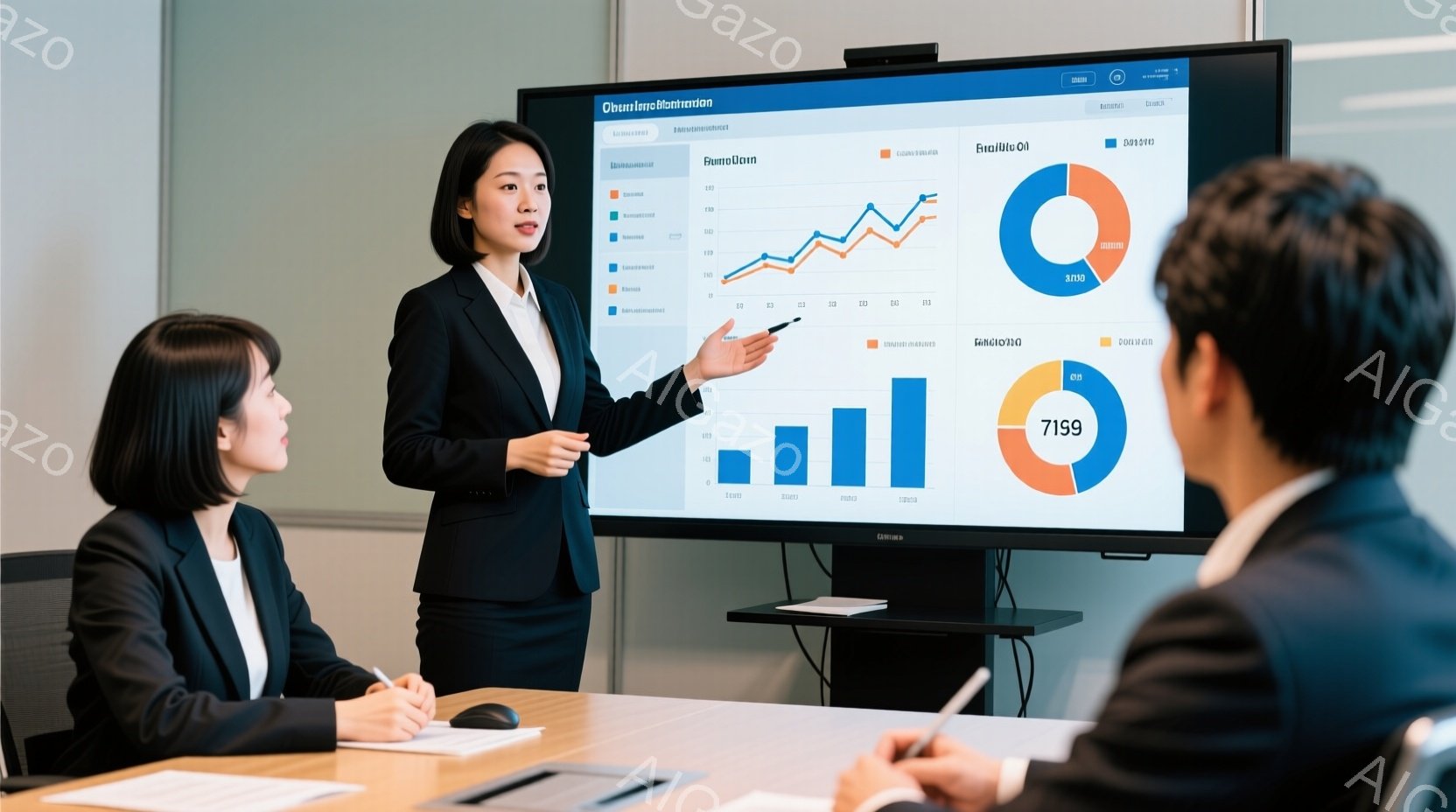 女性がプレゼンテーションを行っており、紺色のスーツに白シャツを着ています。彼女は軽く微笑み、指でグラフを指しながら説明しているようです。背景には会議室のテーブルと、グラフが表示された大きなスクリーンがあり、他の参加者は真剣な表情で彼女の話を聞いています。