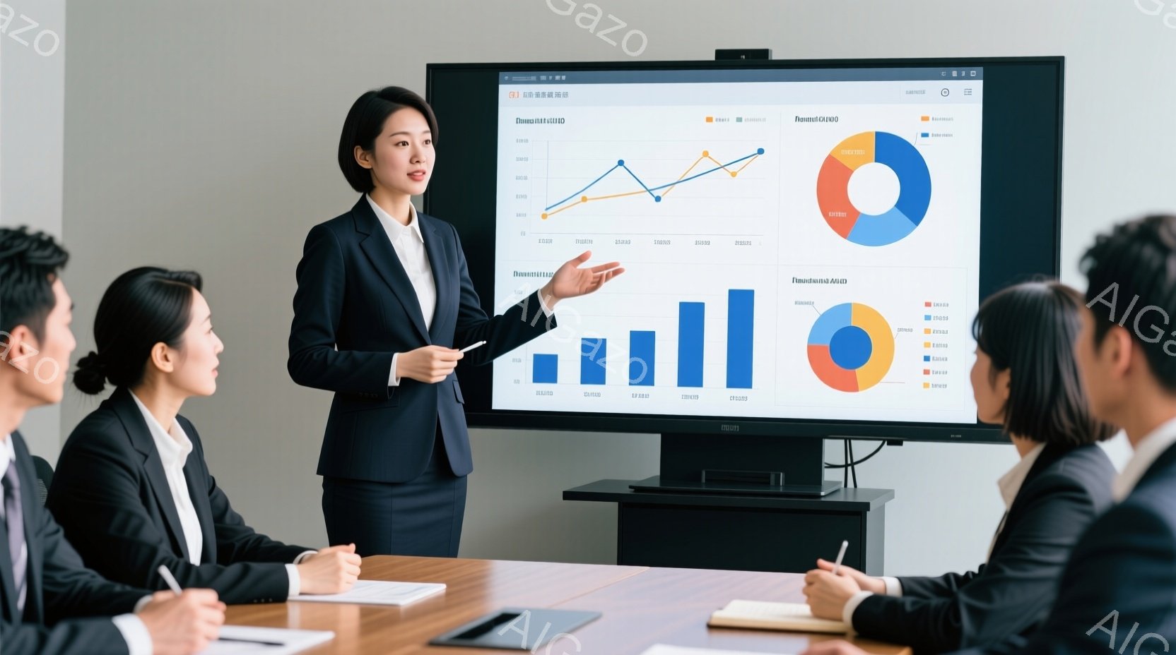 紺色のジャケットとスカートを着用した女性が、会議室でプレゼンテーションを行っています。彼女は指を伸ばしてグラフを指し示し、真剣な表情で説明しています。背景には、スーツ姿の数人の男性が座り、彼女のプレゼンテーションに耳を傾けています。