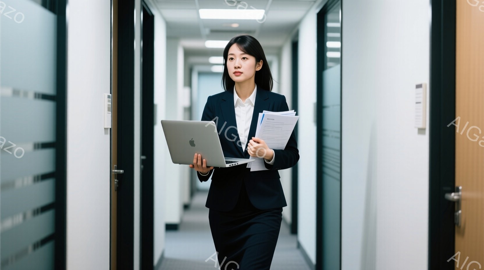 黒いスーツを着た女性が、廊下をまっすぐ歩いています。彼女はノートパソコンと黄色の書類を抱え、表情は真剣で、姿勢もまっすぐです。廊下は白を基調とし、オフィスのような清潔感があり、落ち着いた雰囲気です。