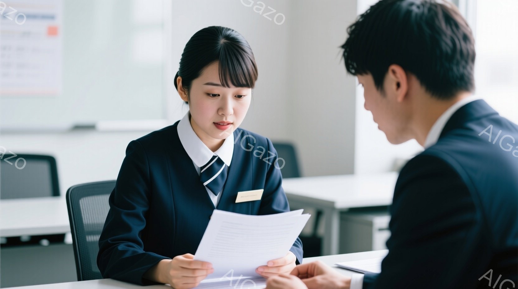 一人の女性と一人の男性がテーブルを挟んで向かい合って座っており、書類に目を通している様子が伺える。女性は紺色のブレザーと白いブラウス、リボンネクタイを着用し、整髪された髪で真剣な表情をしている。背景にはオフィスらしき空間が見え、壁にはメモなどが貼られているため、ビジネスシーンであることがわかる。