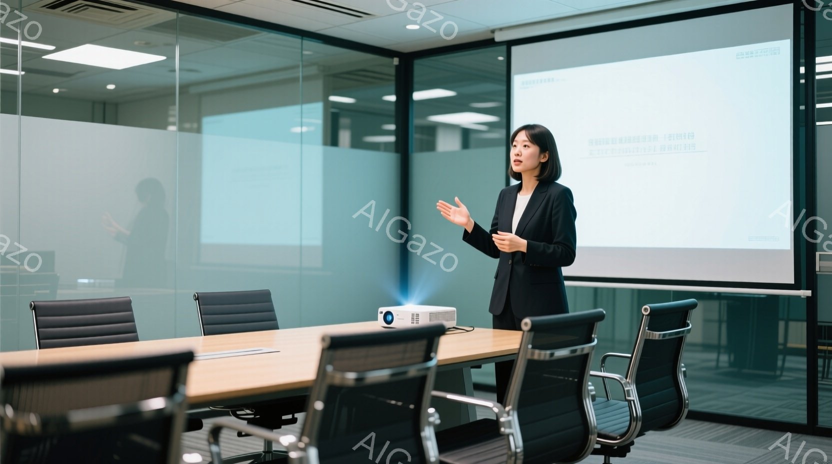 黒いジャケットと白いブラウスを着た女性が、会議室でプレゼンテーションを行っています。彼女は手を広げ、何かを説明しているようなポーズで、表情は真剣です。背景には、白いスクリーンと黒い椅子が並んだ会議テーブル、そしてガラス張りの壁が見え、現代的で清潔感のある雰囲気です。