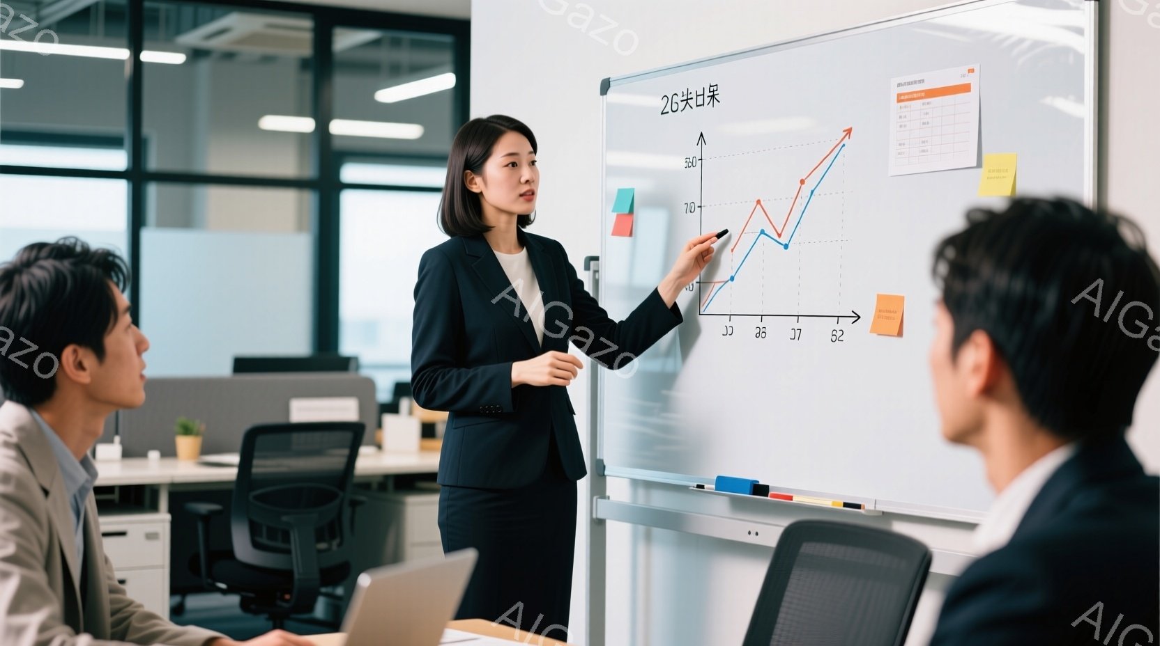 現代的なオフィス空間で、女性がホワイトボードの前でプレゼンテーションを行っている様子が写っています。彼女は黒いスーツを着ており、髪は後ろにまとめられています。参加者はテーブルを囲んで座り、彼女の話に注意深く耳を傾けています。