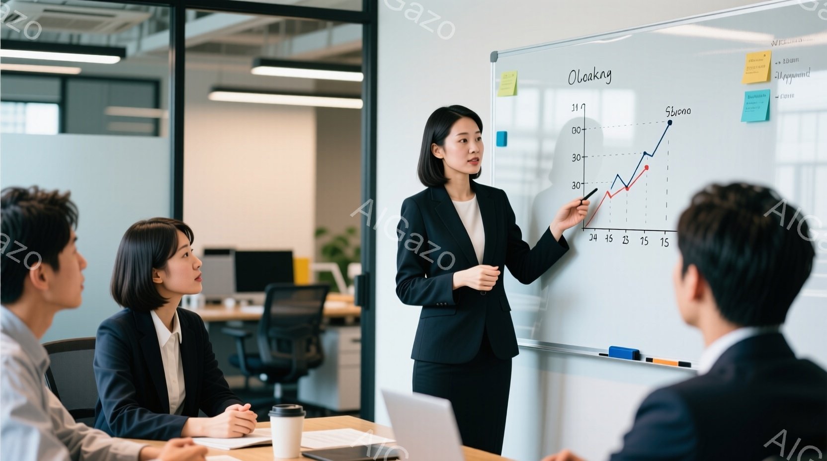 この無料AI生成画像「紺色のビジネススーツを着た女性が、片手を上げて激しく何かを訴えるように立っています。彼女は強い衝撃を受けたかのような表情をしており、周りには他のビジネスマンがパソコンに向かって座っています。背景にはホワイトボードがあり、グラフといくつかの付箋が貼られており、会議室のような場所で緊迫した雰囲気が漂っています。」は、2025年10月26日に作成されました。 サイズは 1664×928px の高解像度で、商用利用も可能なフリー素材として提供しています。