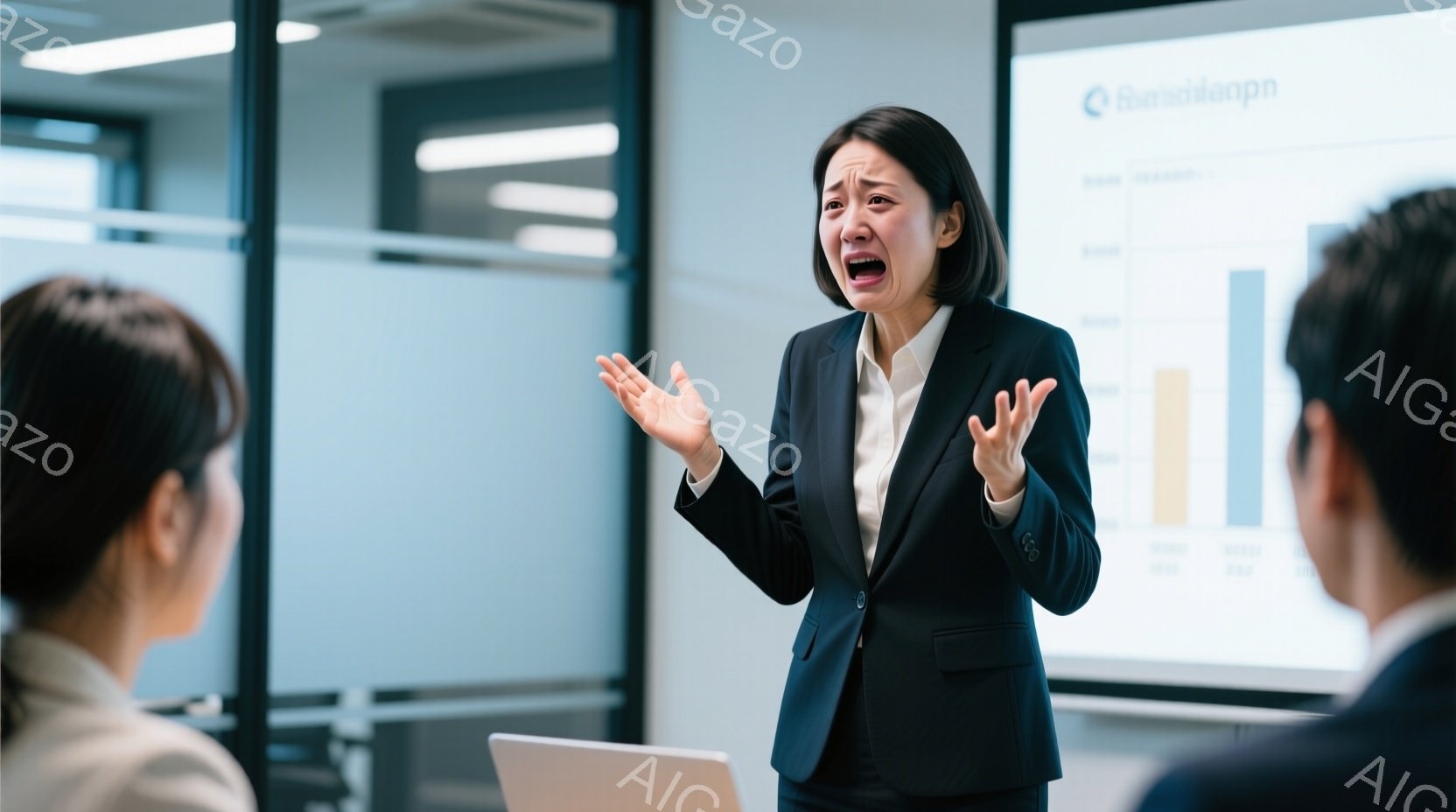 一人の女性が椅子に座り、目に涙を浮かべ、両手を広げて困惑した表情をしています。彼女は黒いスーツジャケットに白いシャツを着ており、髪は後ろでまとめられています。背景には、ホワイトボードを指している男性と、グラフが表示されたスクリーンがあり、オフィスのような室内環境であることがわかります。