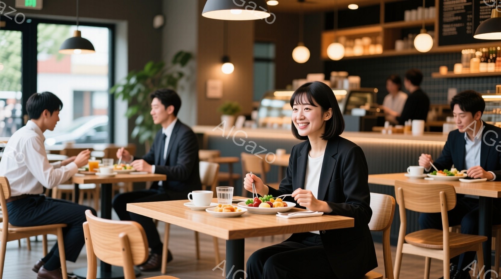 この無料AI生成画像「レストランまたはカフェのような場所で食事をしている女性が写っています。彼女は黒い髪を短く切り揃え、白いブラウスと黒いズボンを身につけ、フォークとナイフを使ってサラダを食べています。背景には他の客がおり、全体的に落ち着いた雰囲気で、明るい照明が印象的です。」は、2025年10月26日に作成されました。 サイズは 1664×928px の高解像度で、商用利用も可能なフリー素材として提供しています。